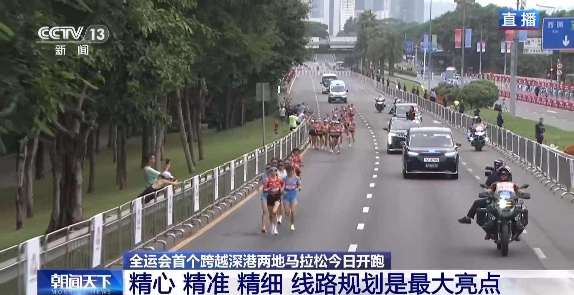 总台央视记者 韩冰:今天上午,本届全运会的马拉松比赛正式拉开大幕,我所在的深圳湾体育中心既是比赛的起点,也是终点。正在进行的是女子马拉松项目,参赛运动员共有33位。