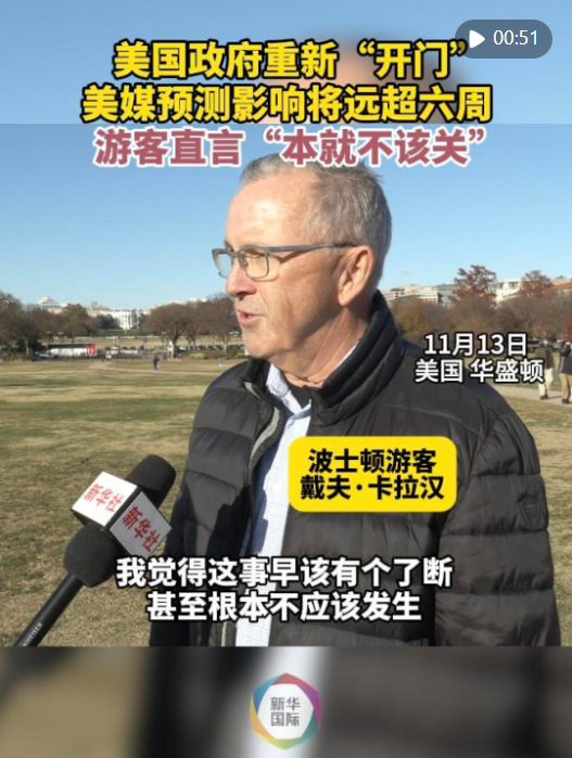 11月13日是持续43天的美国政府“停摆”结束后的第一天。新华社记者在首都华盛顿特区看到,华盛顿纪念碑暂未开放,但周边游客络绎不绝。当被问及对政府重新“开门”的感受时,有人直言“太好了”,有人表示“总算松了一口气”,也有人抱怨“本来就不该关门!”