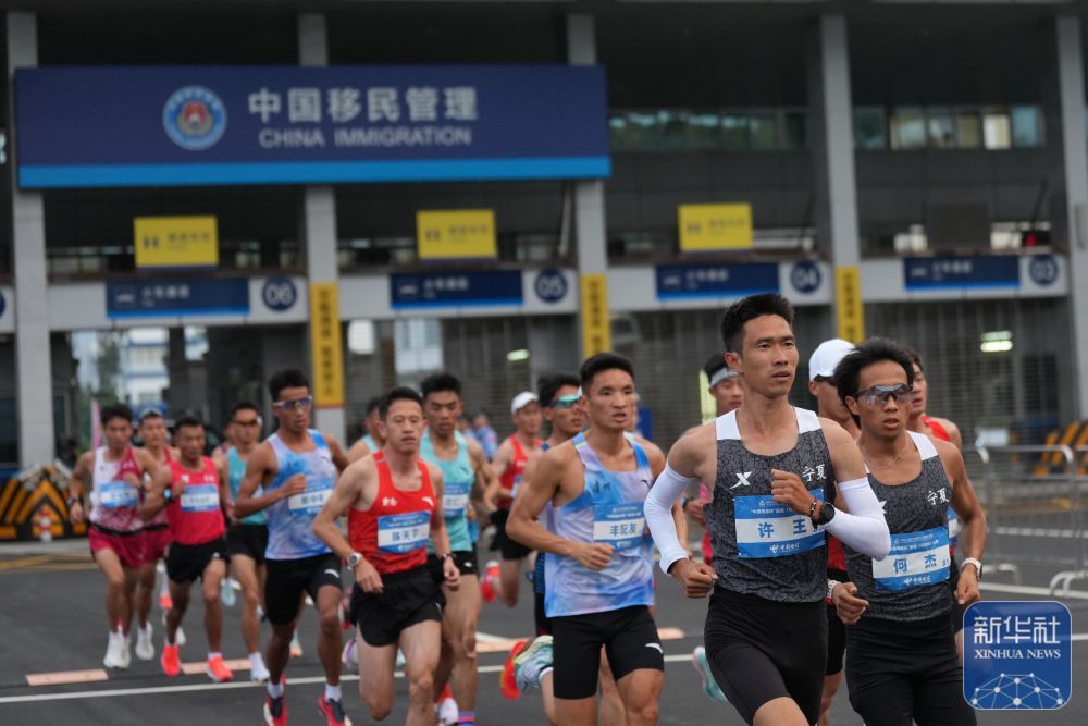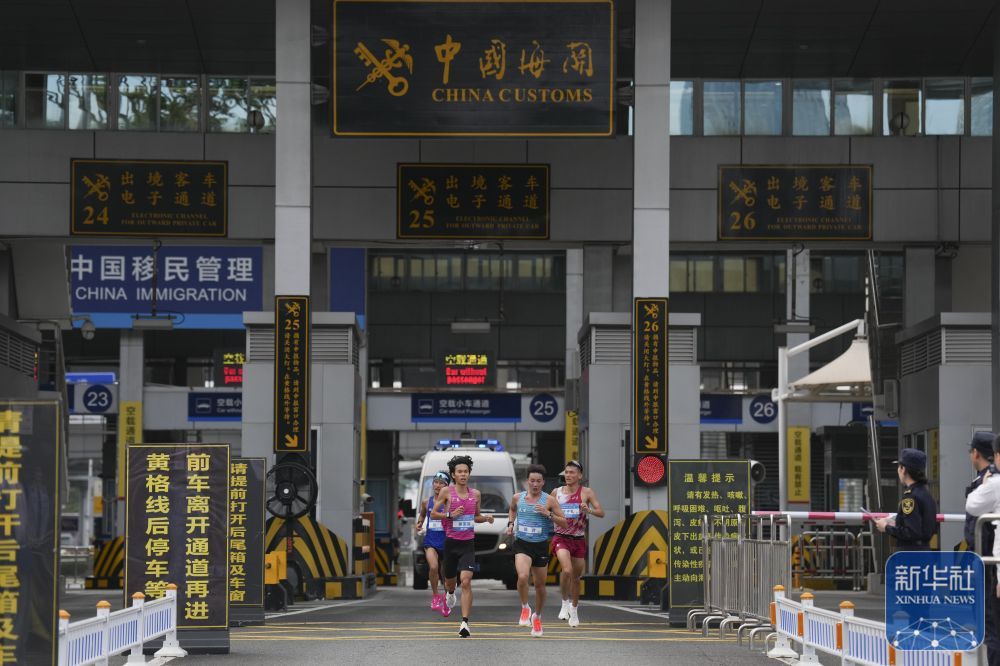↑ 参赛选手在比赛中经过深圳湾口岸。 新华社记者 丁增尼达 摄