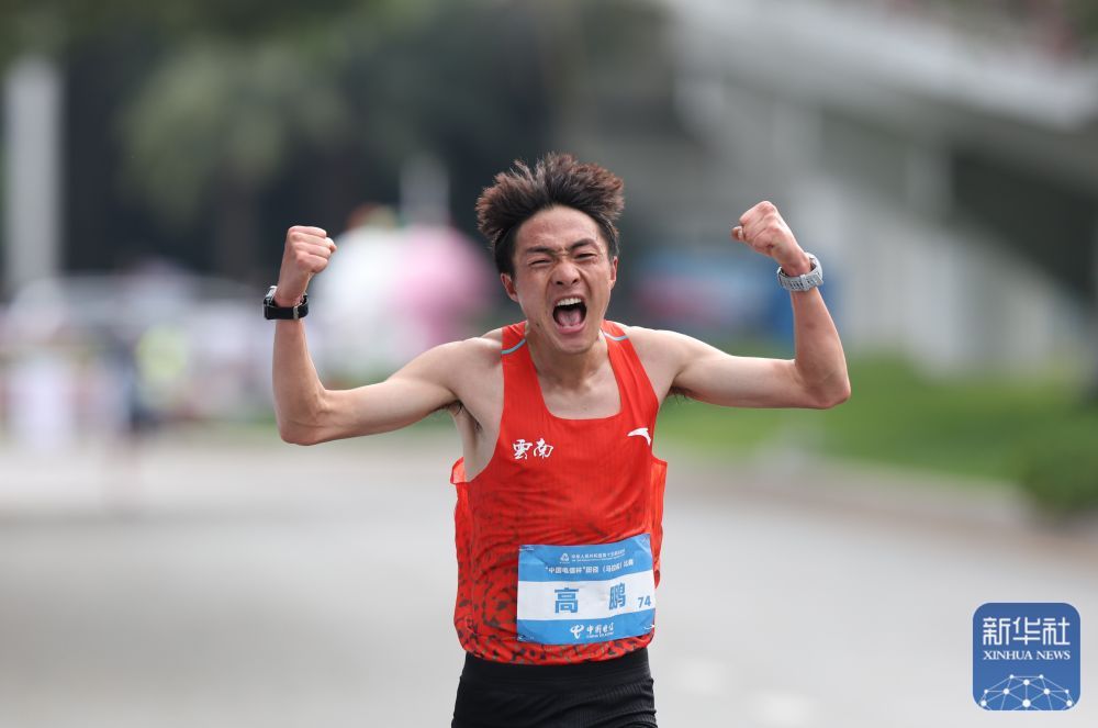 ↑ 云南队选手高鹏在比赛中到达终点,获得亚军。 新华社记者 丁汀 摄