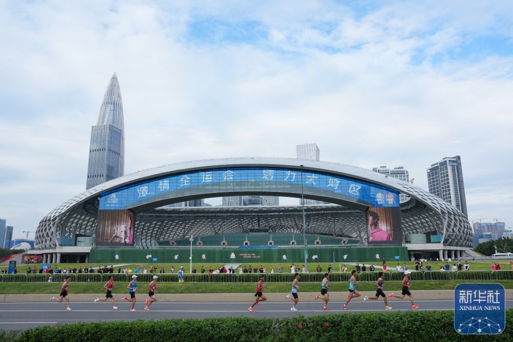 ↑ 参赛选手经过深圳湾体育中心。 新华社记者 江汉 摄