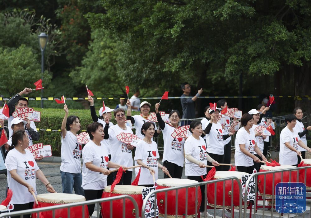 ↑ 市民在路旁为参赛选手击鼓加油。 新华社记者 毛思倩 摄