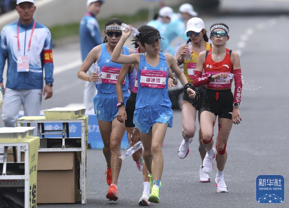 ↑ 参赛选手在比赛中补充水分,为身体降温。 新华社记者 毛思倩 摄