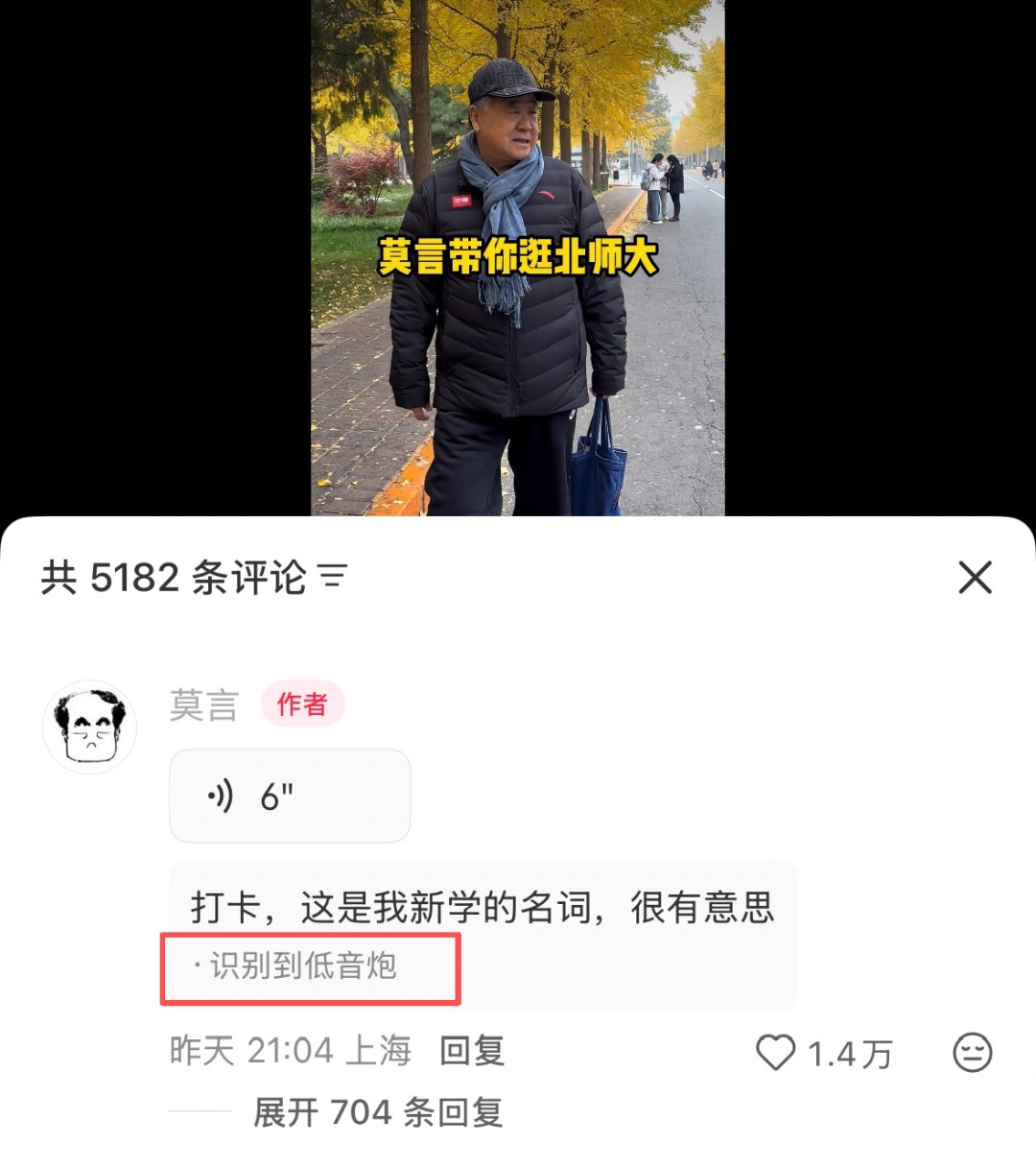 视频发布后,莫言在评论区语音留言称,“打卡,这是我新学的名词,很有意思。”声音被系统识别为“低音炮”。