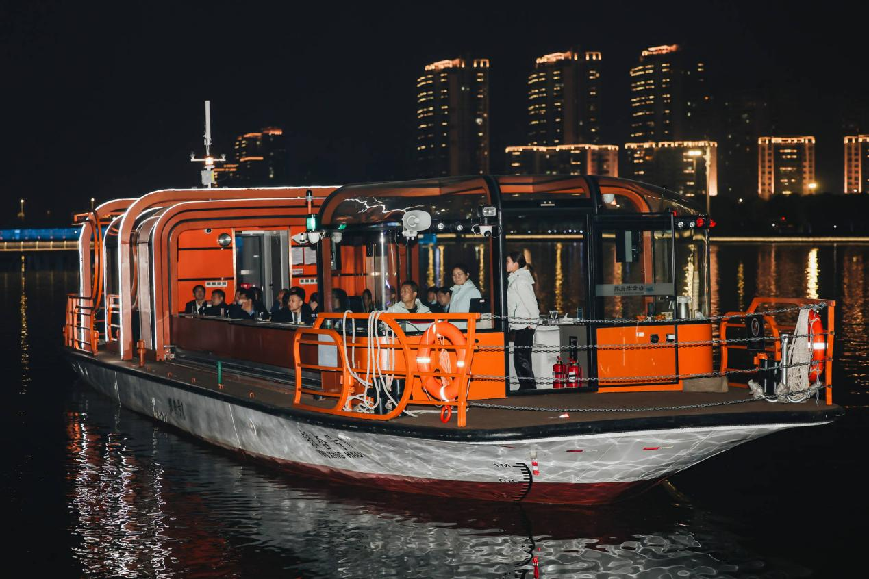 暮色渐浓,8公里白云湖岸线次第亮起灯火,两岸楼宇流光溢彩、水光辉映。游船缓缓驶离编钟码头,晚风携着湖水的清润拂面,武汉博主关若曦立刻举起相机:“这光影也太绝了!比镜头里看到的更震撼。”话音刚落,3D水幕在湖面开启“时光隧道”,炎帝神农耕种的光影画面渐次浮现,古老编钟的金石之声再次响起,仿佛穿越回五千年前的农耕文明时代。