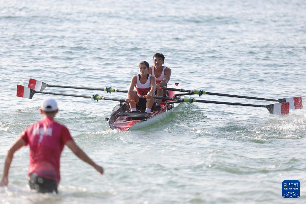 11月15日,广东队选手王云飞(左)和张桂萍在混合双人双桨计时赛中。