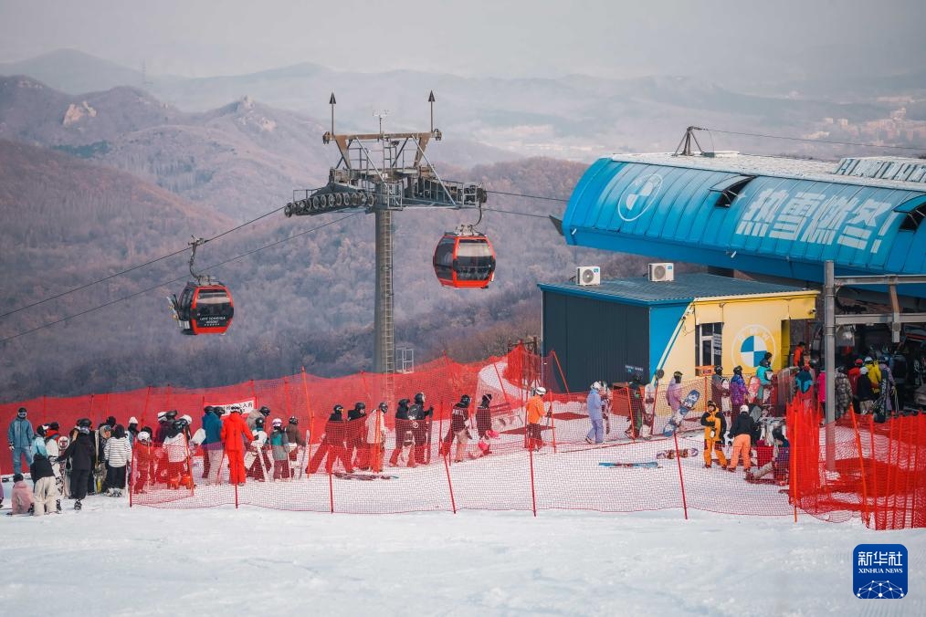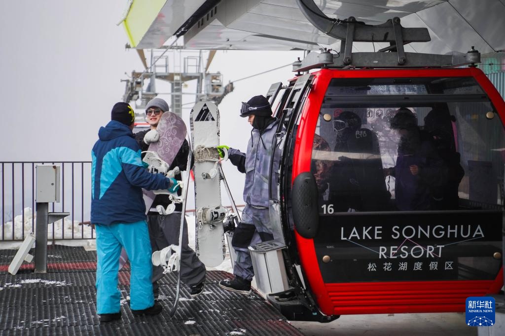 11月15日,滑雪爱好者在位于吉林省吉林市的中旅松花湖度假区排队乘坐缆车。