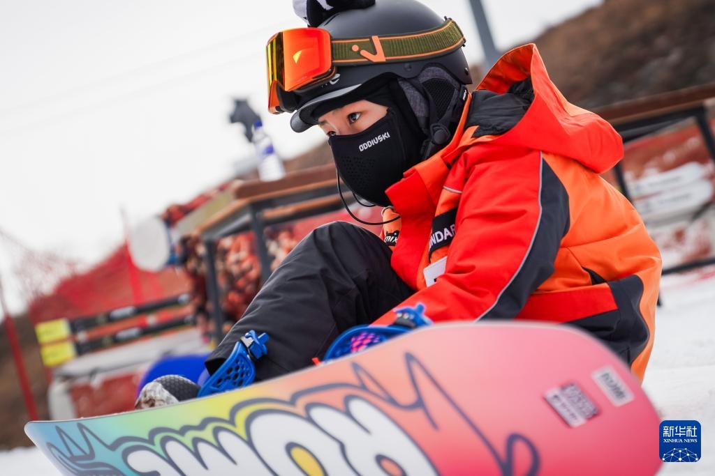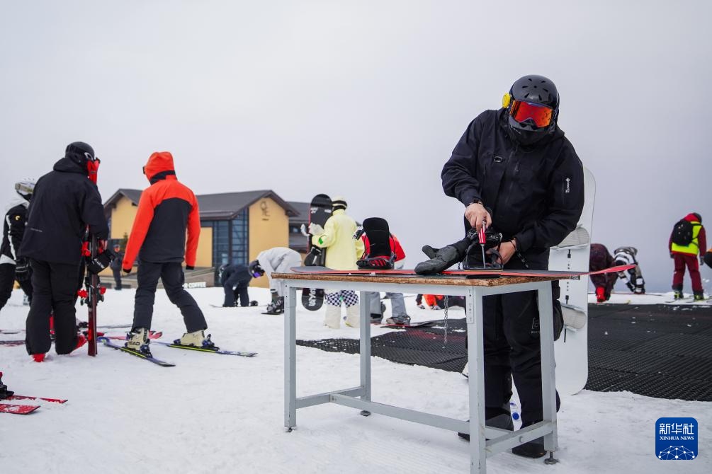 11月15日,在位于吉林省吉林市的中旅松花湖度假区,滑雪爱好者在山顶调整雪板。