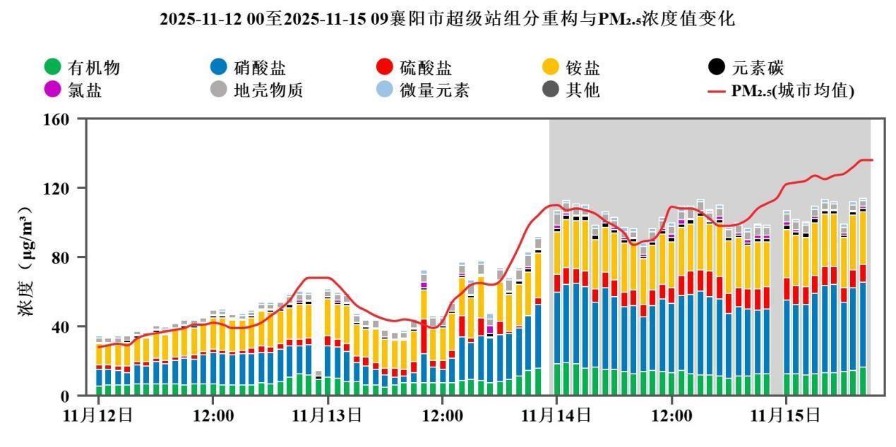 四是区域污染物排放强度仍较大,静稳条件下气态污染物二次转化贡献较大。11月8-11日,全省重点行业大气污染物排放量以及重型柴油车、非道路移动机械等移动源活动水平回升,区域排放强度较高。从颗粒物组分特征来看,襄阳PM2.5硝酸盐的浓度和占比在13日12时后均明显上升,污染高值时段组分重构以硝酸盐为主,其次为铵盐,表明NOx、NH3等气态污染物的二次转化对PM2.5贡献较大。