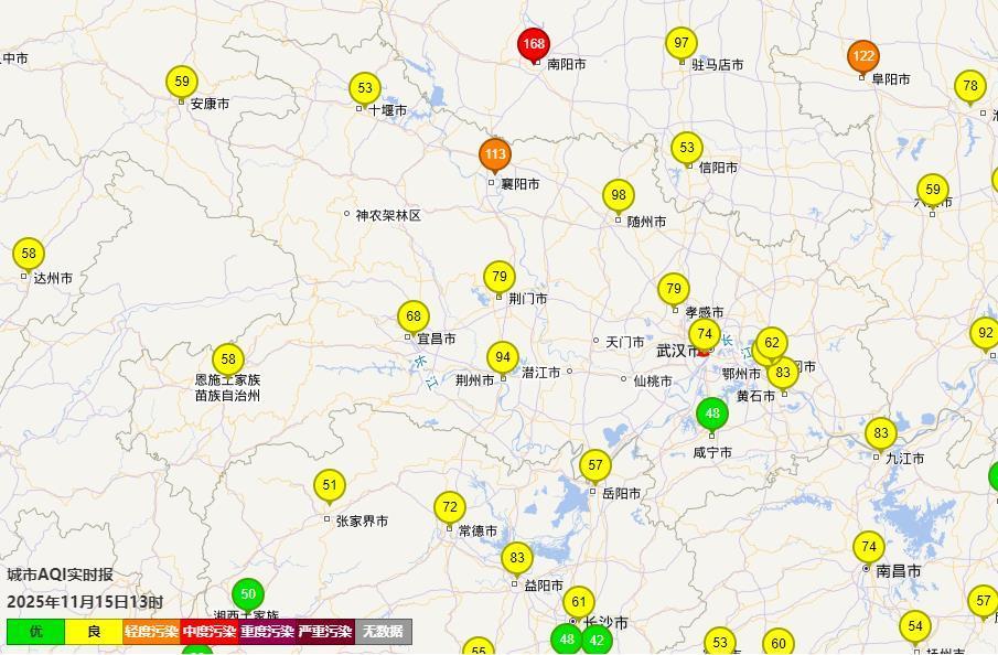 13日下午到夜间起,受上游污染传输滞留和本地不利气象条件下的污染积累影响,襄阳、荆门、荆州、随州小时浓度明显升高;14日转静稳态,荆门、襄阳日均空气质量为轻度污染;截至15日13时,襄阳空气质量为轻度污染,其余城市以良为主。