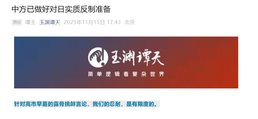 11月15日,玉渊谭天发文称,针对高市早苗的露骨挑衅言论,我们的忍耐,是有限度的。