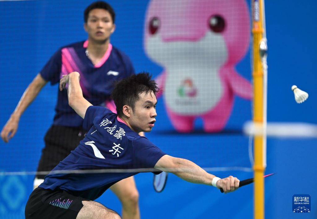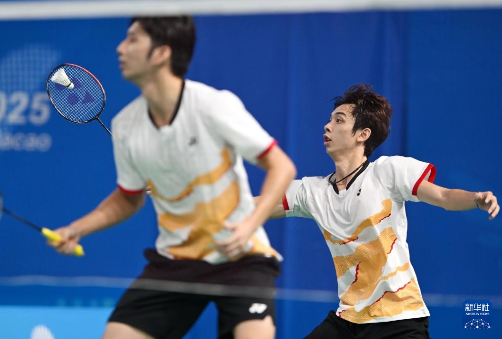 11月15日,广东队组合邓浩轩/徐嘉骏(左)在男双比赛中。他们2比1战胜香港队组合洪魁骏/吕俊玮,晋级下一轮。
