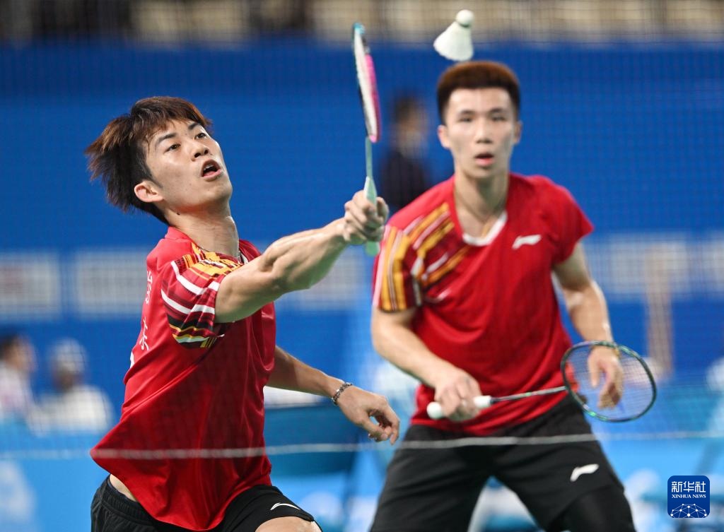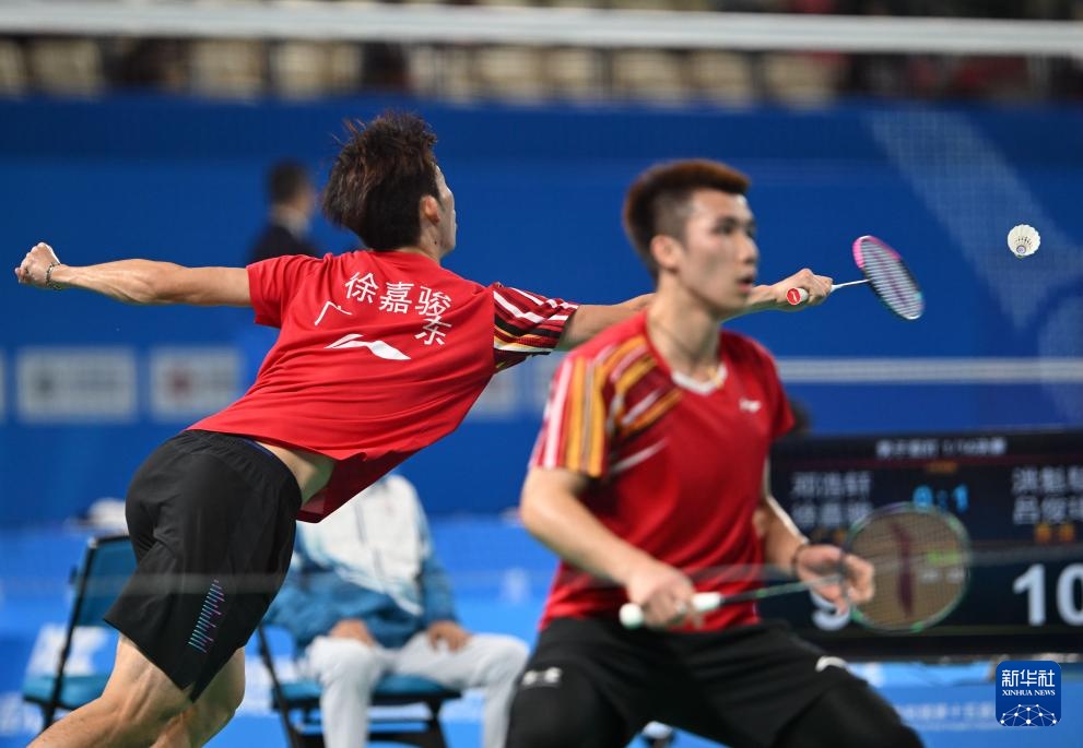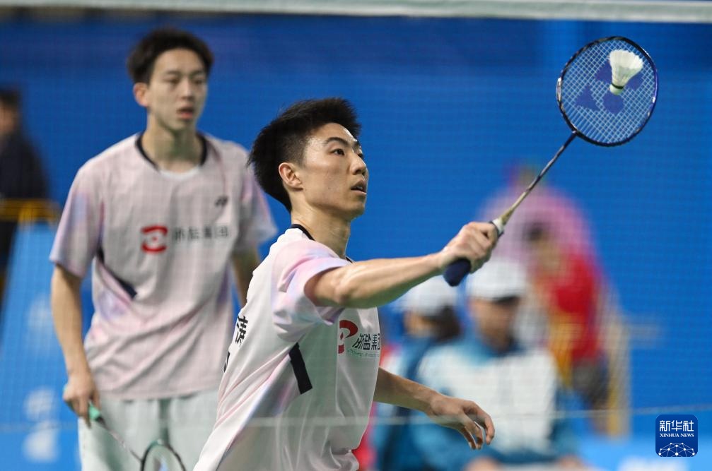 11月15日,福建队组合韩呈恺/林祥毅(右)在男双比赛中。他们2比1战胜浙江队组合李昀泽/孙超,晋级下一轮。