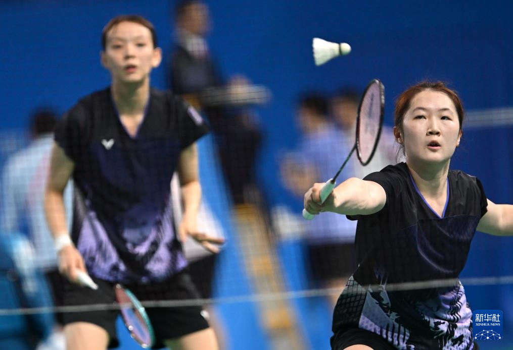 11月15日,上海队组合罗意/廖立曦(左)在女双比赛中。她们2比0战胜浙江队组合郑岚/吴梦莹,晋级下一轮。