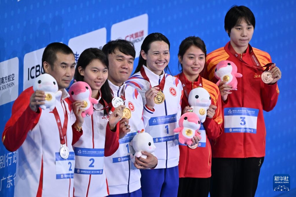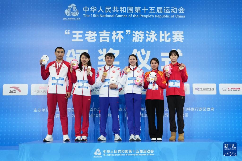 11月15日,冠军香港队选手何诗蓓(右三)、亚军山东队选手杨浚瑄(左二)、季军江西队选手程玉洁(右一)和教练在颁奖仪式上合影。