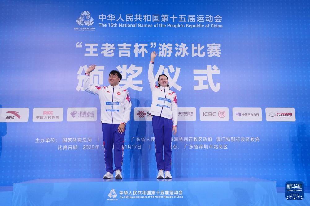 11月15日,冠军香港队选手何诗蓓(右)和教练在颁奖仪式上向观众致意。