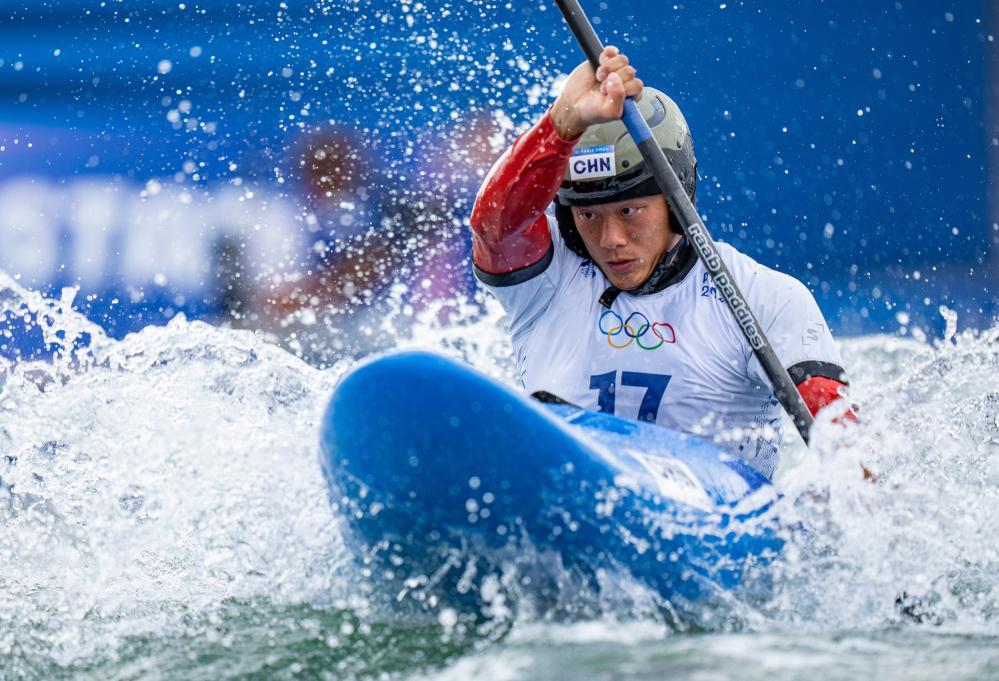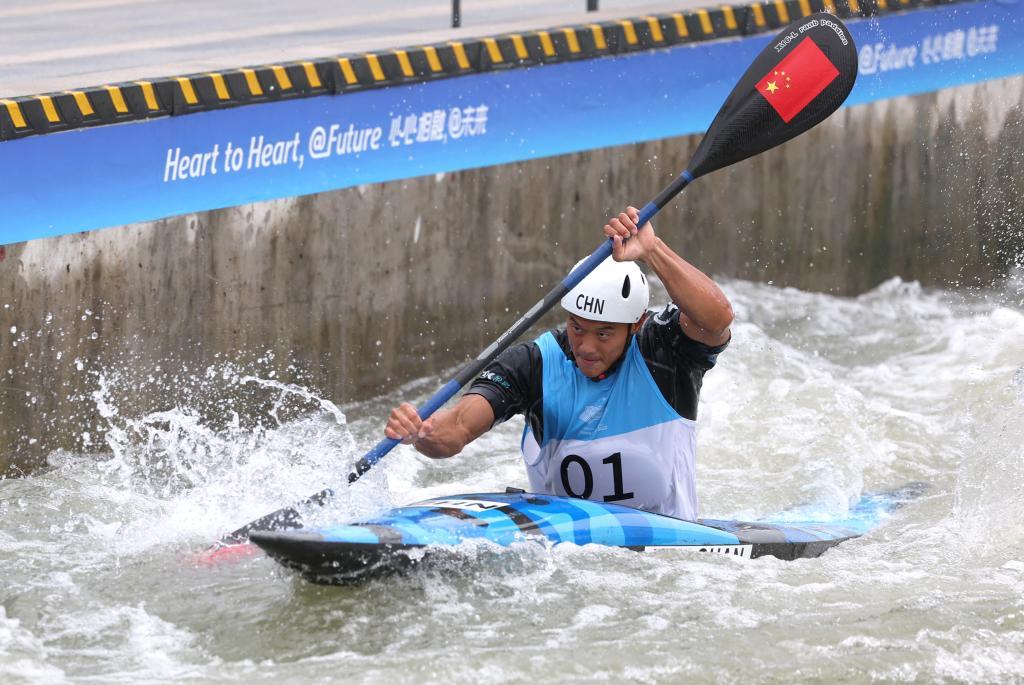 2024年8月2日,中国选手全鑫在比赛中。当日,巴黎奥运会皮划艇激流回旋男子极限皮艇计时赛在马恩河畔韦尔水上体育场举行。新华社记者 孙非 摄