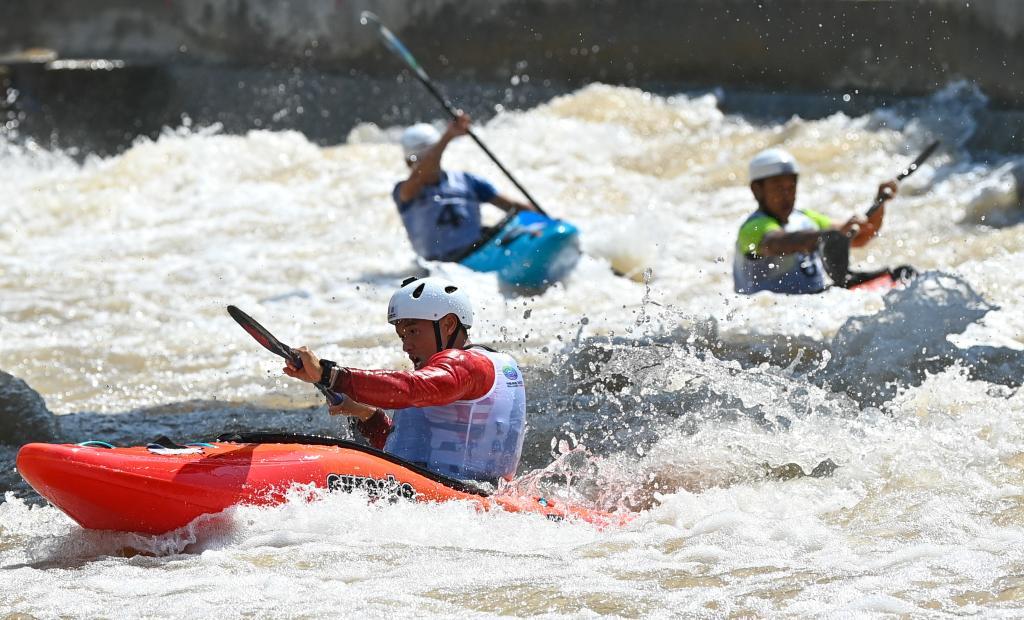 2023年10月7日,中国选手全鑫在比赛中。当日,杭州亚运会皮划艇激流回旋项目男子单人皮艇决赛在杭州富阳水上运动中心举行。新华社记者 杜潇逸 摄