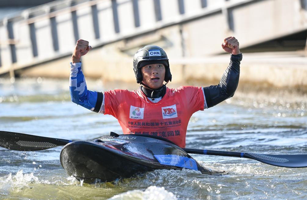 11月15日,福建队选手全鑫在赛后庆祝胜利。当日,第十五届全国运动会皮划艇激流回旋项目男子极限皮艇决赛在广州举行。新华社记者 唐奕 摄
