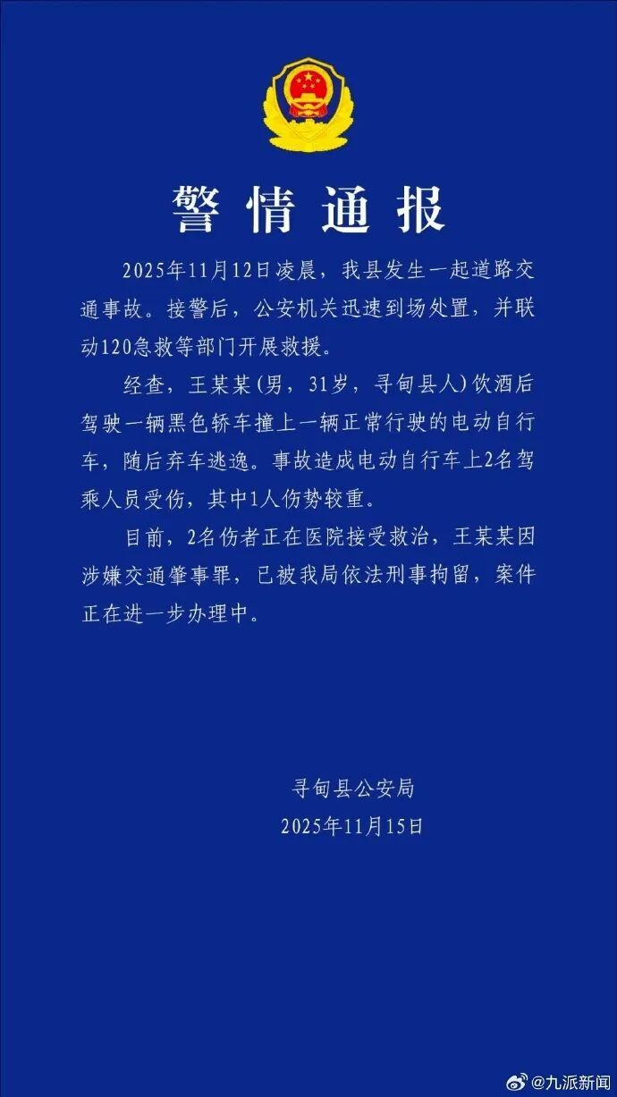 经查,王某某(男,31岁,寻甸县人)饮酒后驾驶一辆黑色轿车撞上一辆正常行驶的电动自行车,随后弃车逃逸。事故造成电动自行车上2名驾乘人员受伤,其中1人伤势较重。