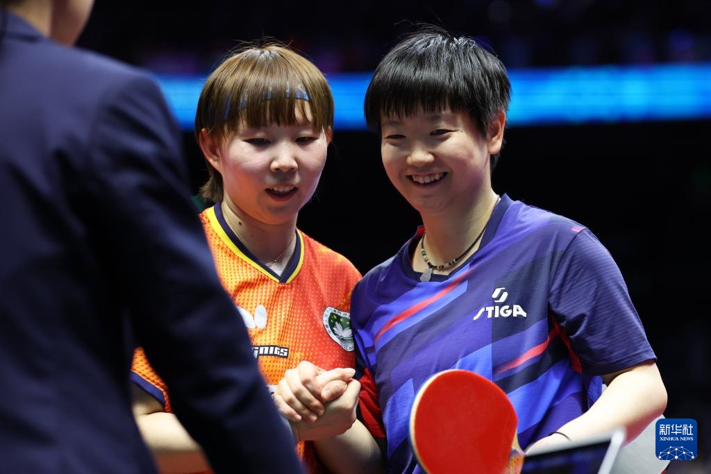 11月15日,河北队选手孙颖莎(右)和澳门队选手朱雨玲在比赛后致意。