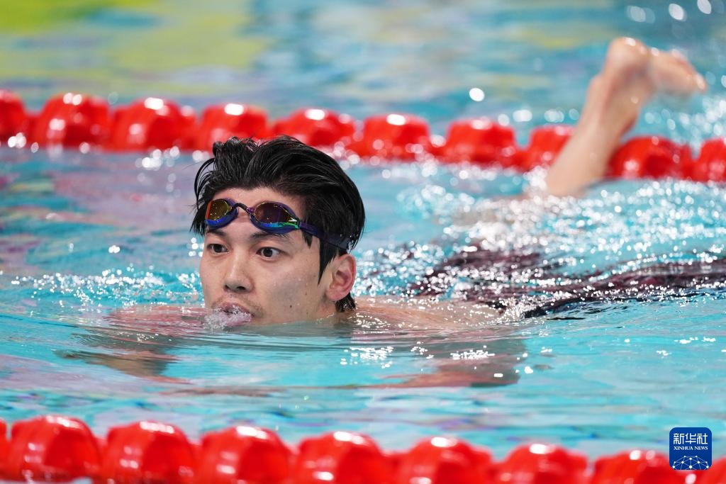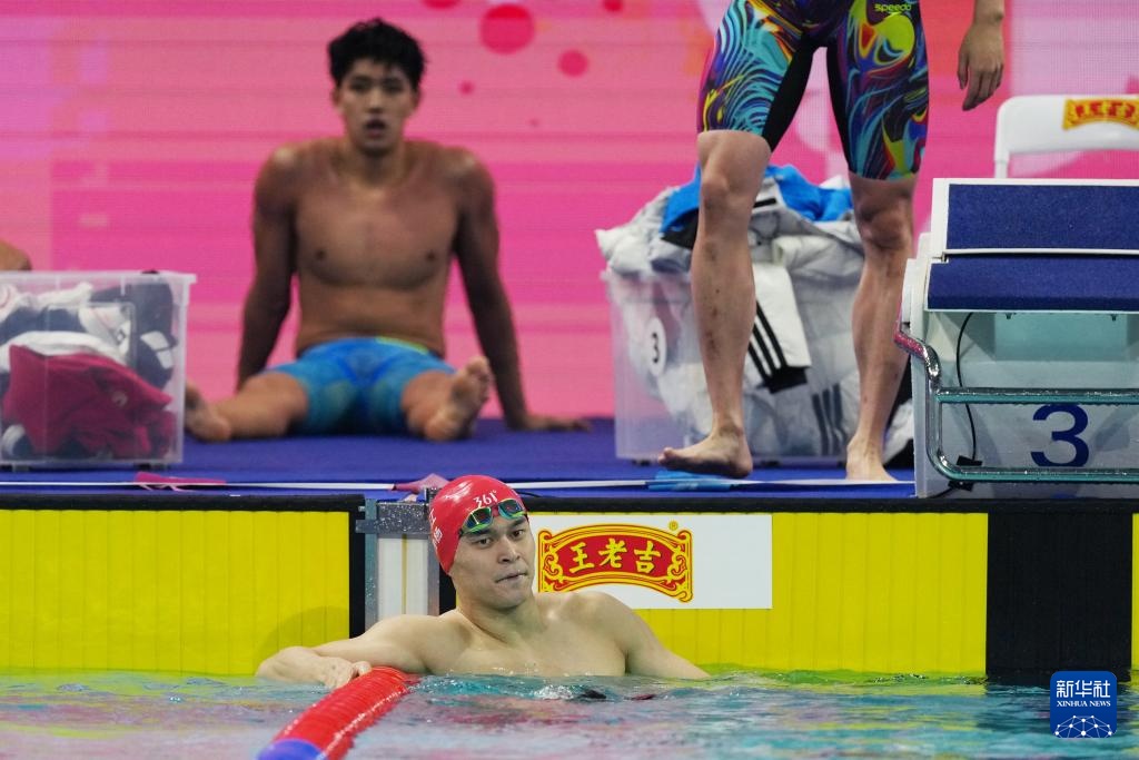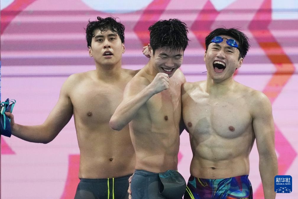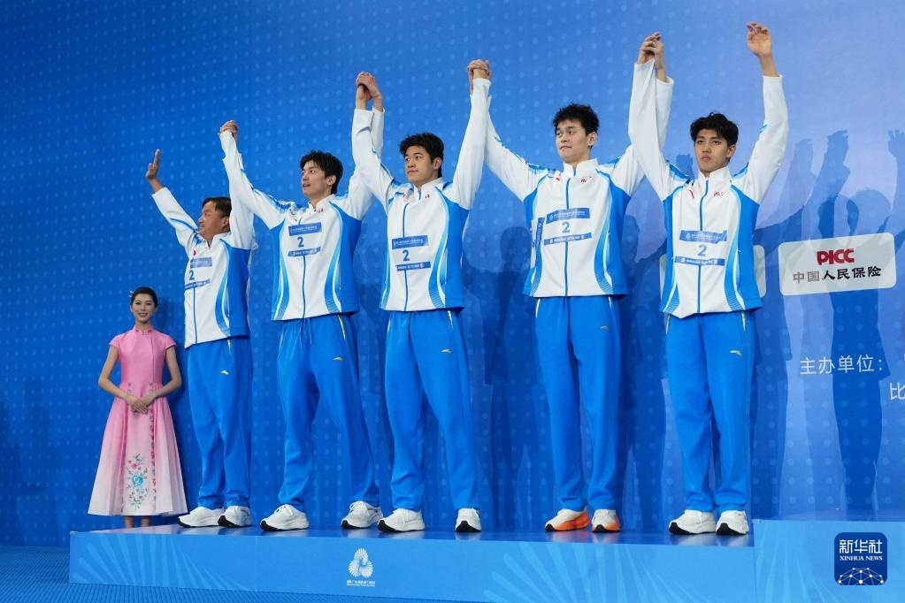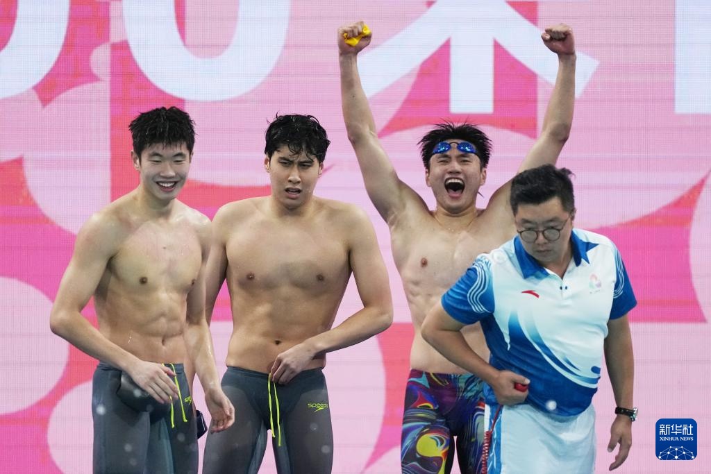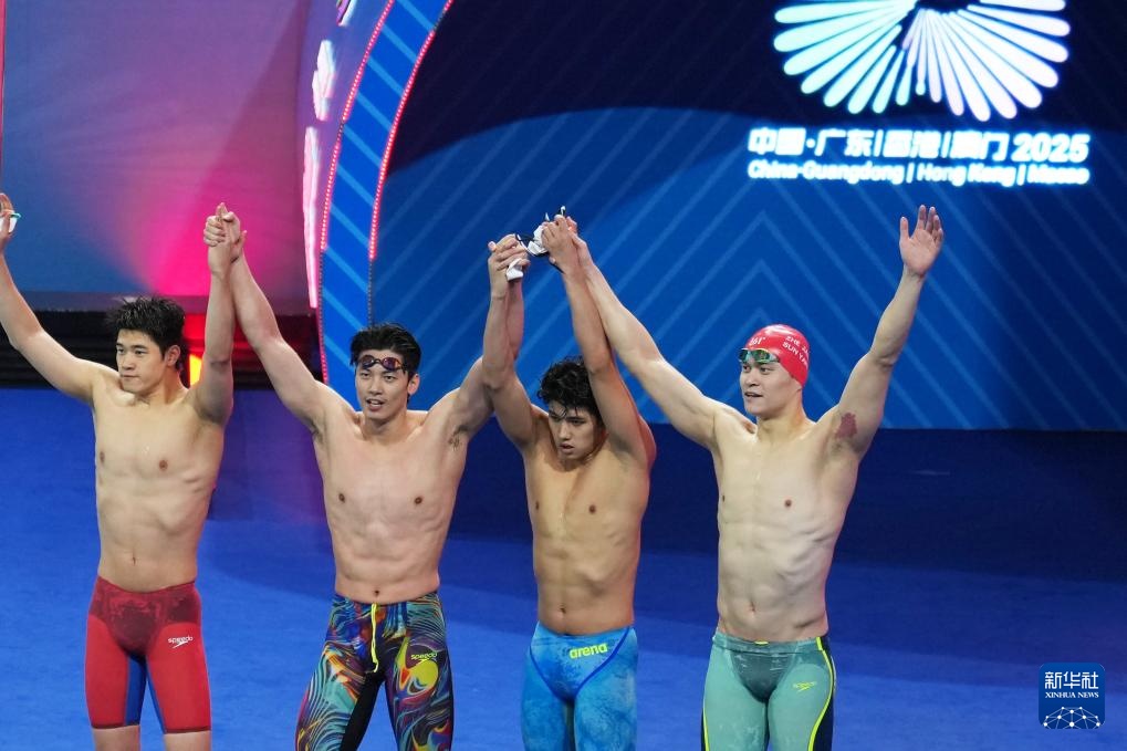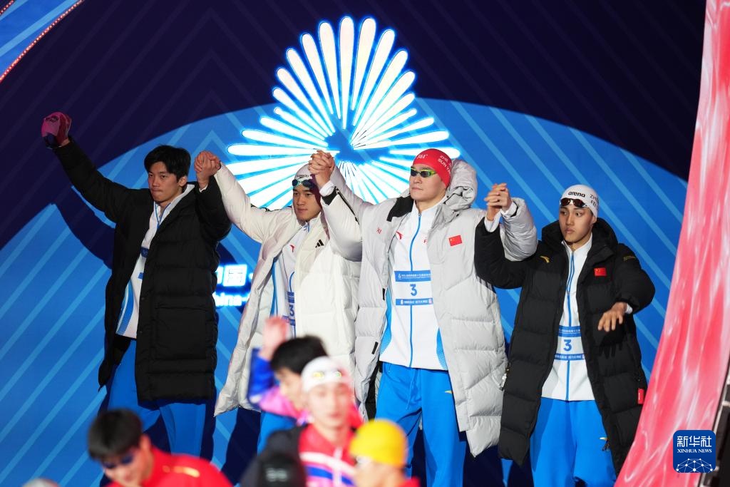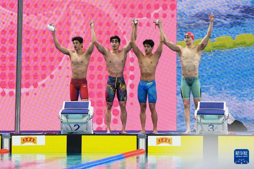 11月15日,浙江队选手费立纬、孙杨、潘展乐和汪顺(从右至左)在比赛中出场。