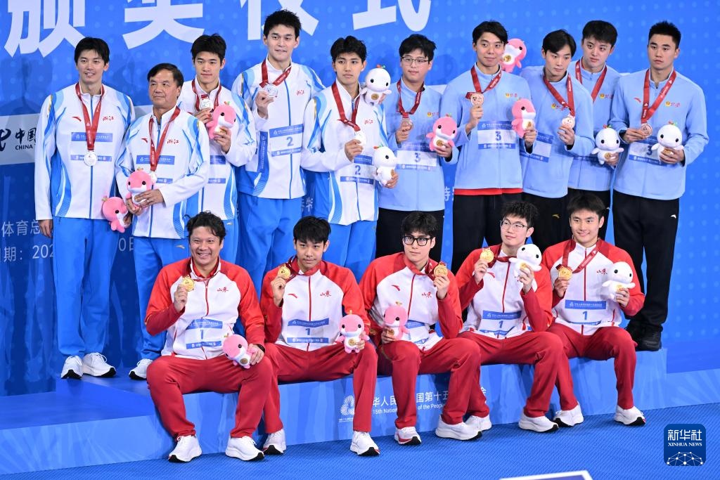 11月15日,山东队第四棒选手张展硕(下左)在比赛后庆祝夺冠。