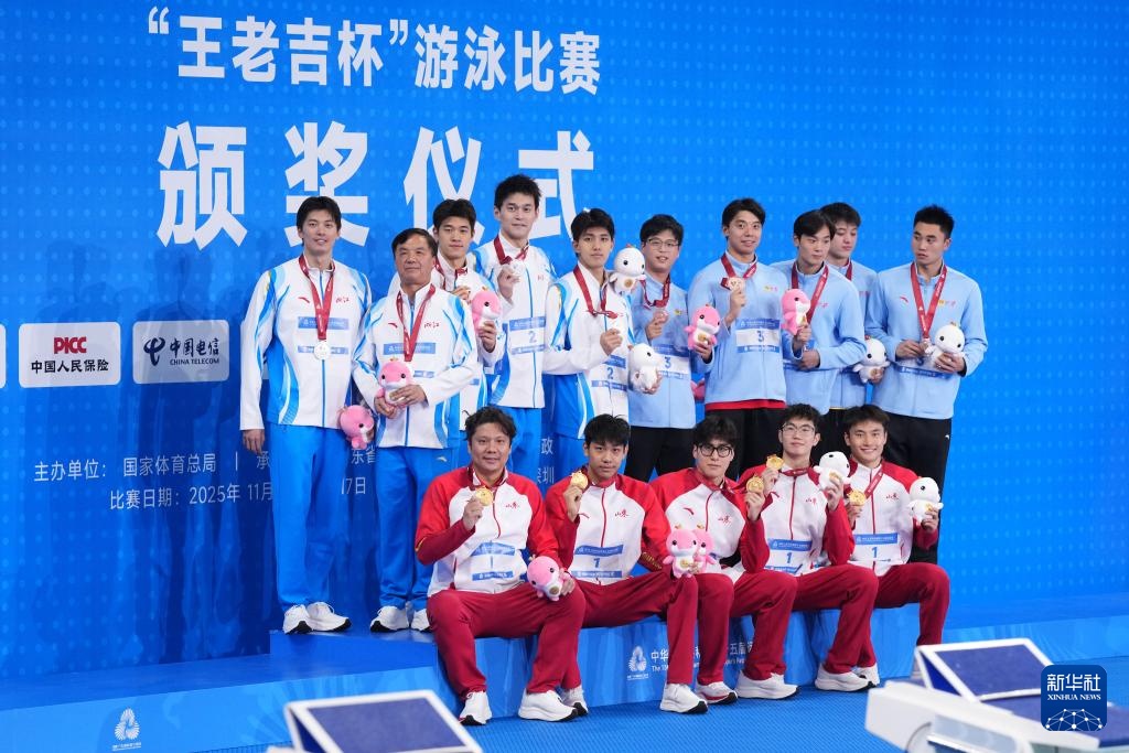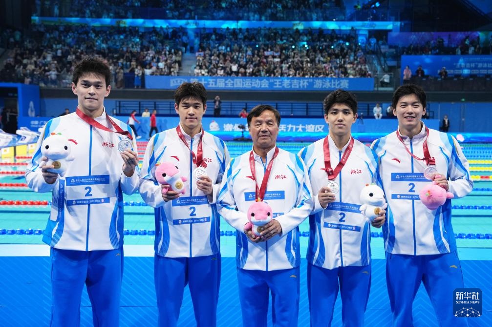 11月15日,亚军浙江队选手孙杨(左一)、潘展乐(左二)、费立纬(右二)、汪顺(右一)和教练朱志根在颁奖仪式后合影。