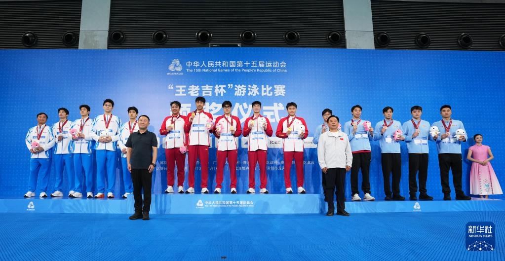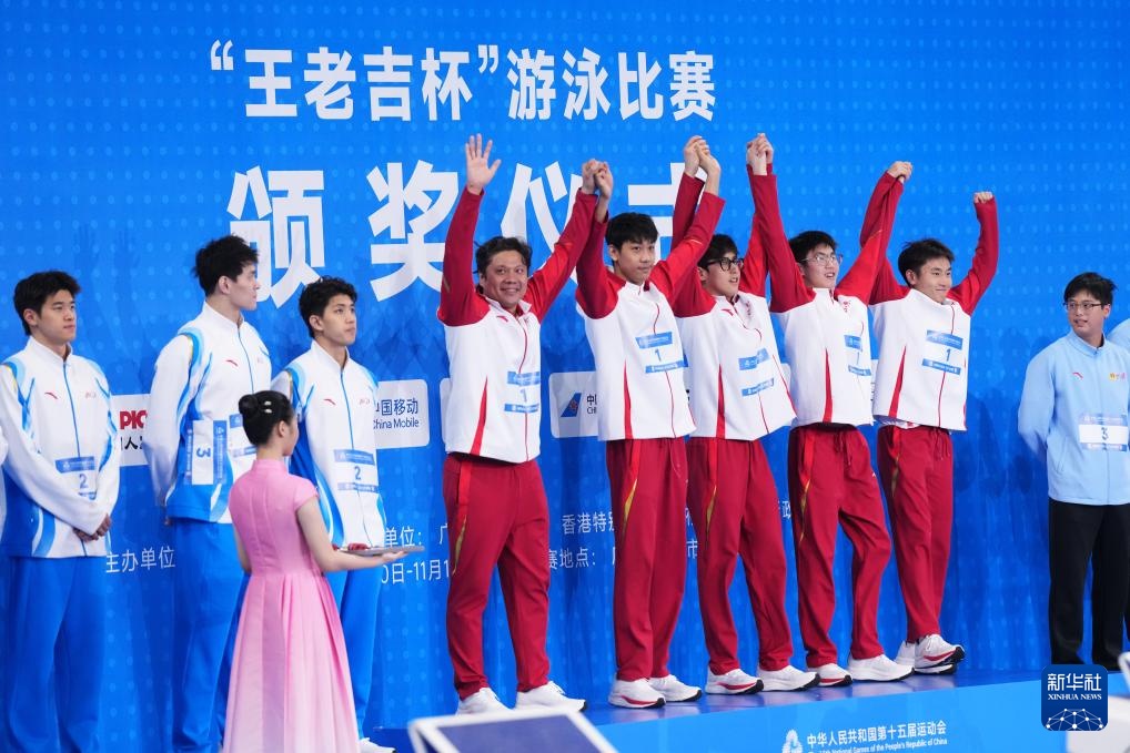 11月15日,亚军浙江队选手费立纬、孙杨、潘展乐、汪顺(从右至左)和教练朱志根在颁奖仪式上向观众致意。