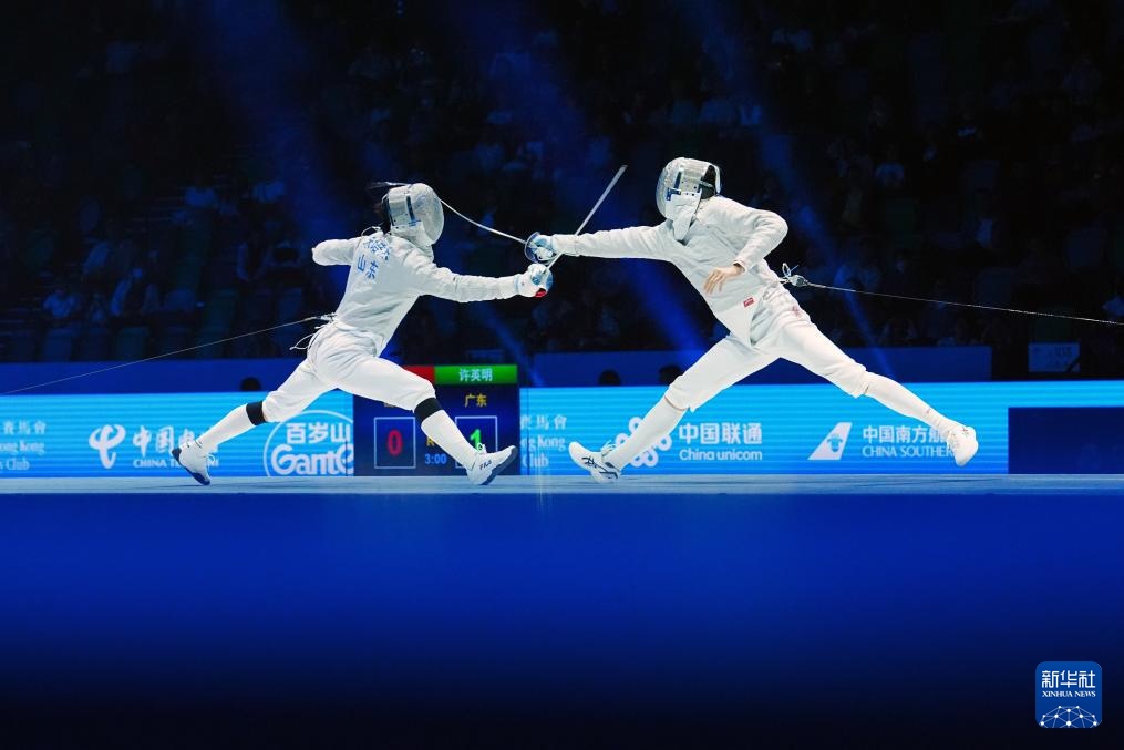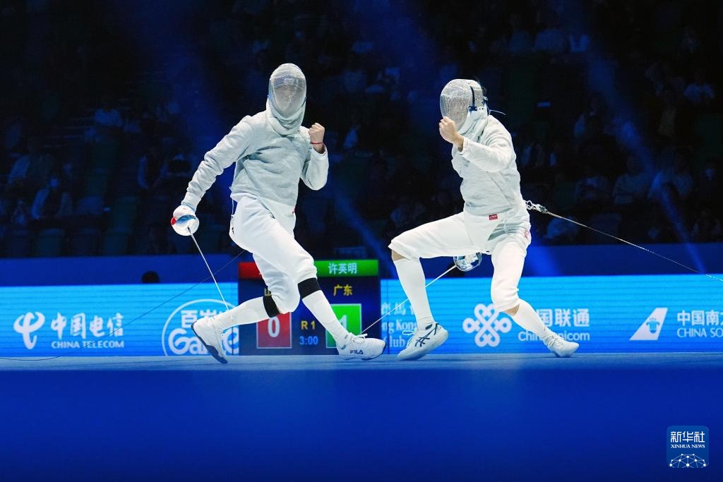 11月15日,山东队选手朱培杰(左)和广东队选手许英明在比赛中。