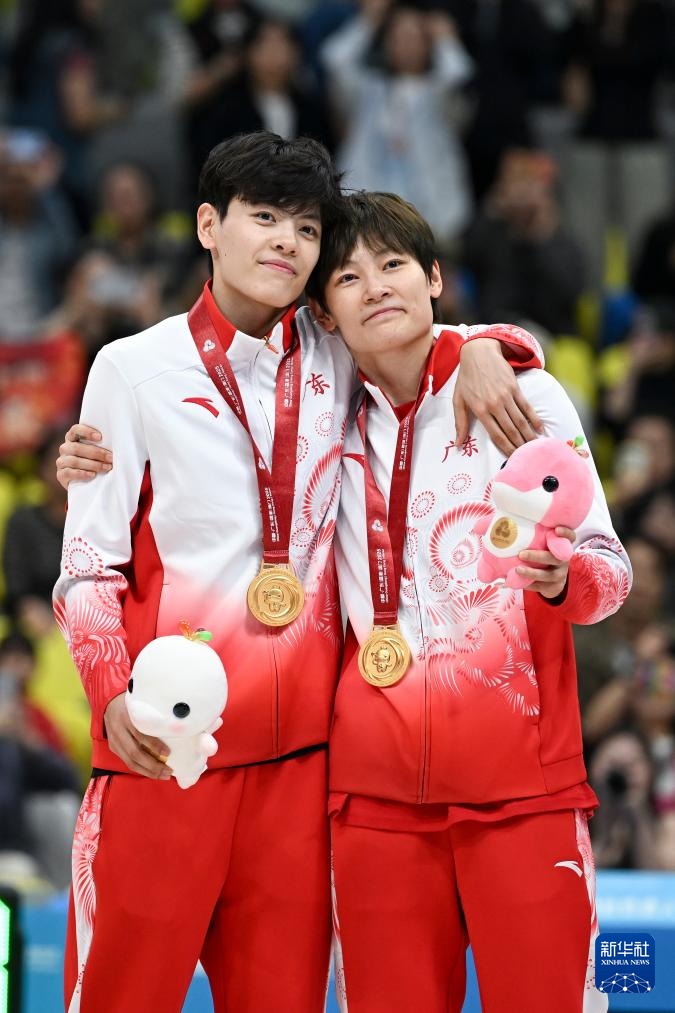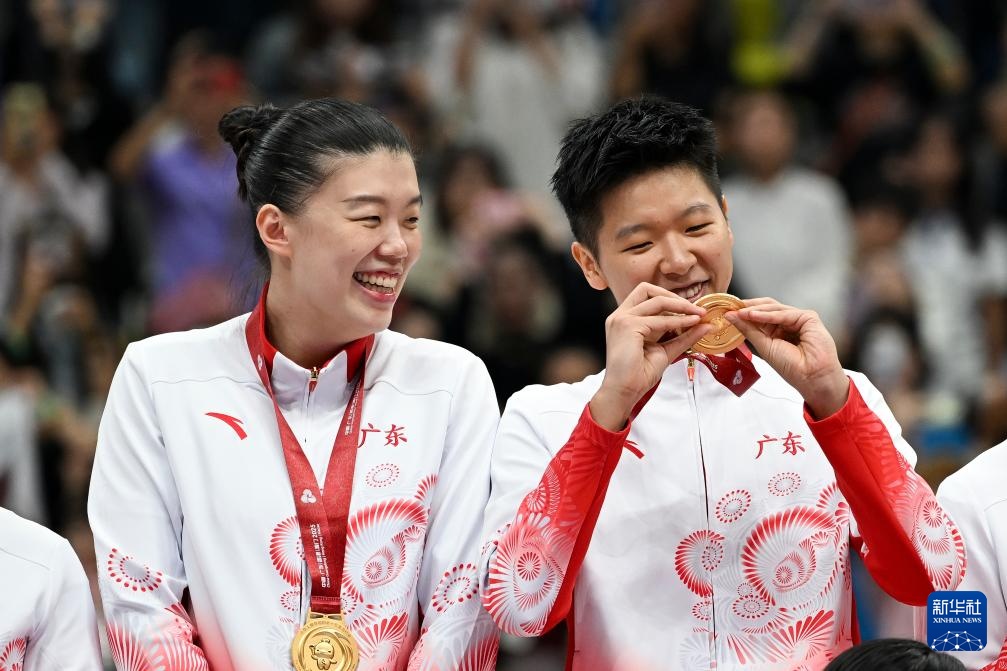 11月15日,广东队球员黄思静(右)在颁奖仪式上查看金牌。