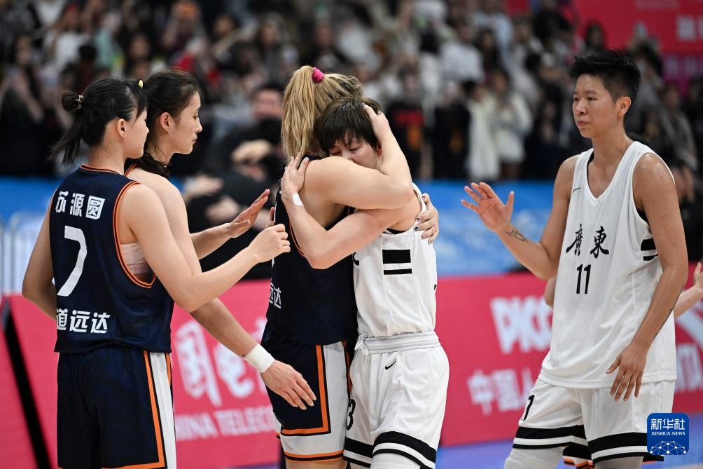 11月15日,四川队球员李梦(左三)与广东队球员杨力维(左四)在赛后拥抱。
