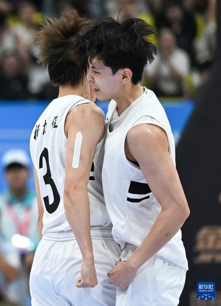11月15日,广东队球员杨力维(右)与杨舒予在颁奖仪式上拥抱。