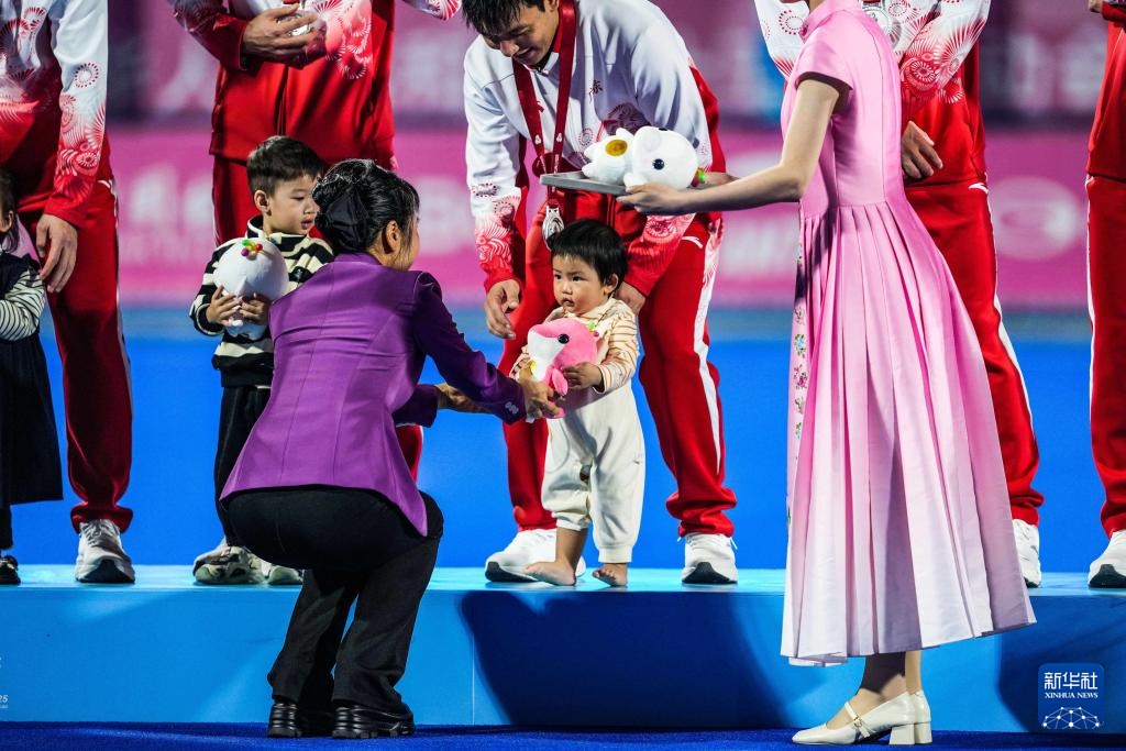 11月15日,颁奖嘉宾将吉祥物玩偶送给广东队选手的亲属。