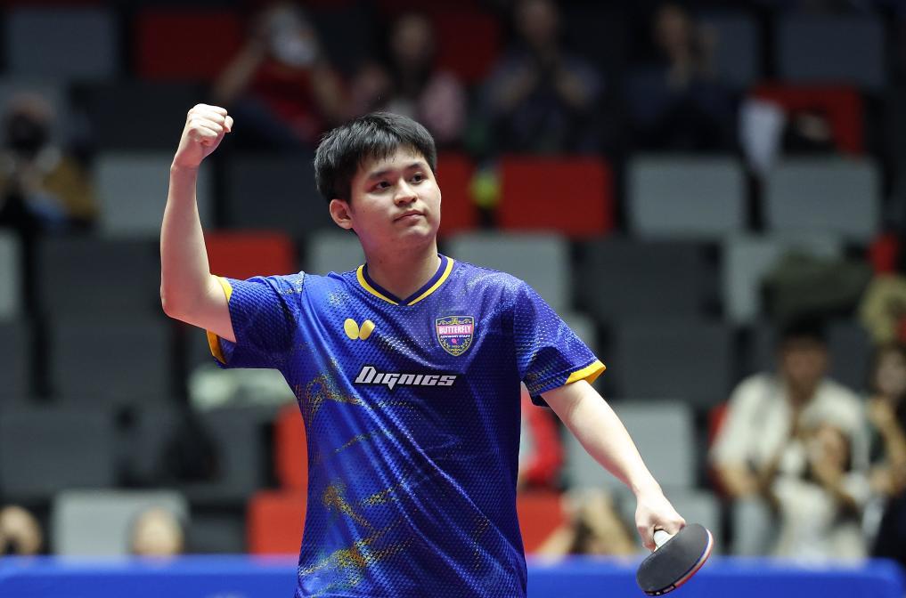 11月15日,林诗栋庆祝比赛胜利。新华社记者 梁旭 摄