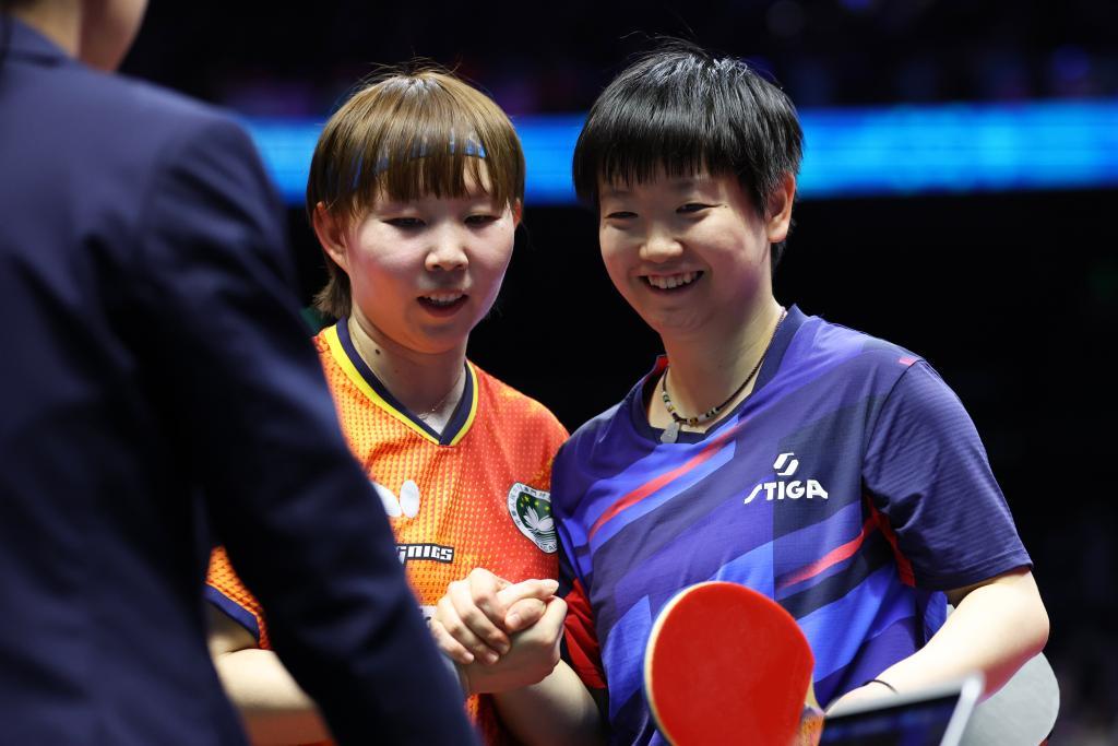 11月15日,孙颖莎(右)和朱雨玲在比赛后致意。新华社记者 梁旭 摄