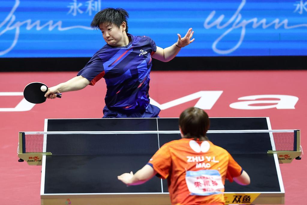 11月15日,澳门队选手朱雨玲在比赛中发球。新华社记者 梁旭 摄
