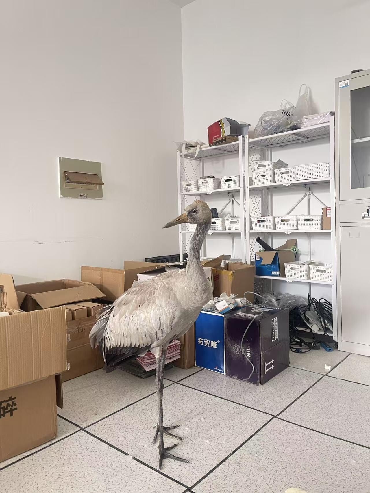 11月11日上午8时许,湖北科技职业学院人工智能学院教师钱哲在教学楼内意外发现“不速之客”——一只羽毛脱落、行动迟缓的灰鹤。钱哲察觉其状态异常,便将其安置在办公室,并联系武汉九峰森林动物园专业人员进行救助。