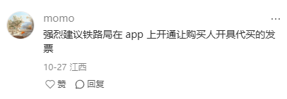 代购人代开发票极为不便。网友“婧娃儿”说,帮老人或同事朋友买的车票不能帮着开票,年长的同事自己又不会弄,只能自己专门往车站跑一趟,系统太不方便了。