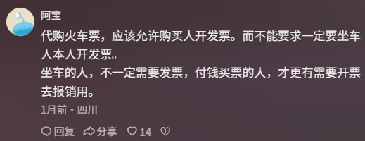 代购人需要发票作为报销依据。网友“怡冰”说,给公司出差人员买了火车票,自己开不了票怎么报账,这个规定太不人性化了。坐车的人,不一定需要发票,而付钱买票的人,往往更需要开票报销。河南巩义“瑞丰石墨制品”称,给客户订的高铁票,为啥自己不能开票报销?