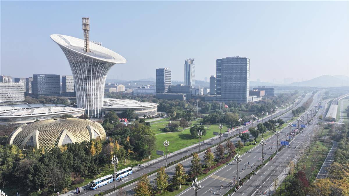 选手途经未来科技城时,与标志性建筑“马蹄莲”同框,成为赛道上一道靓丽风景线。