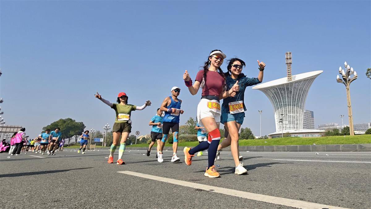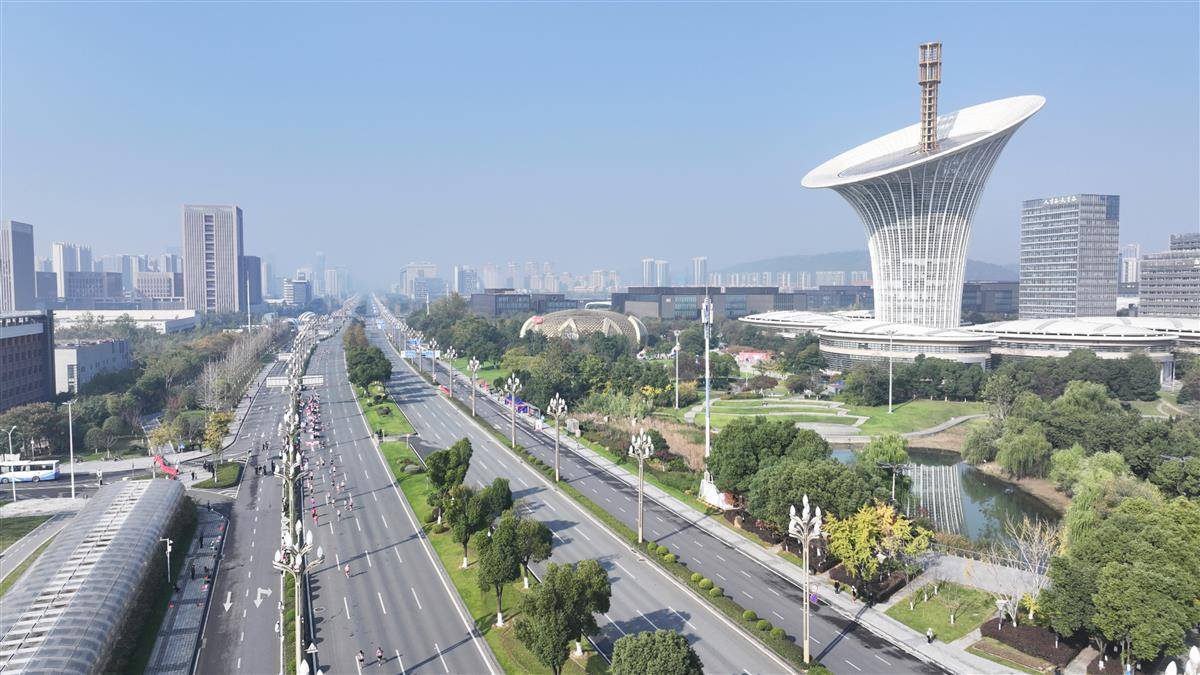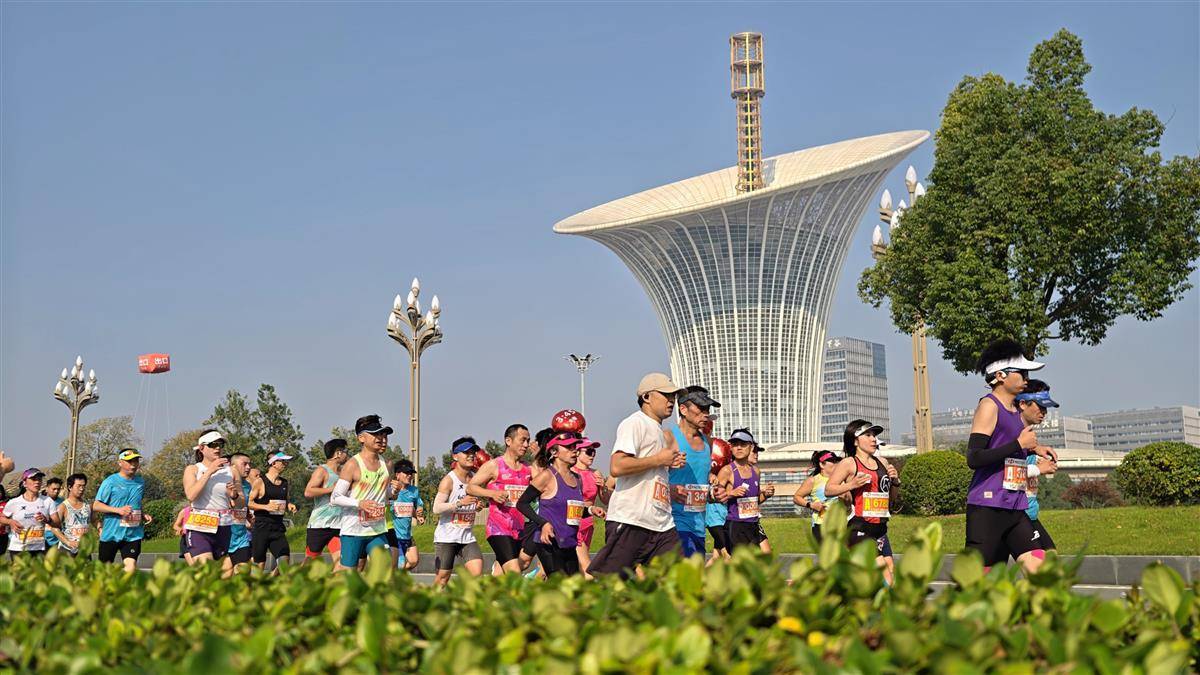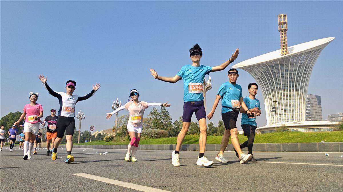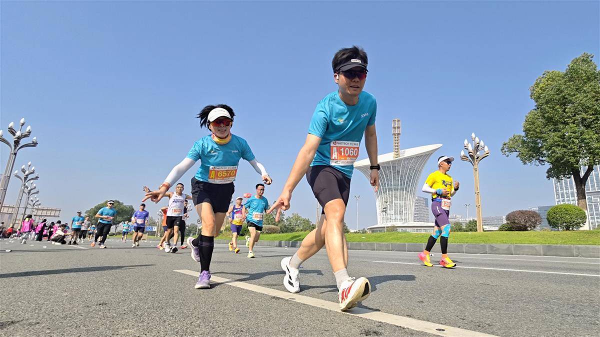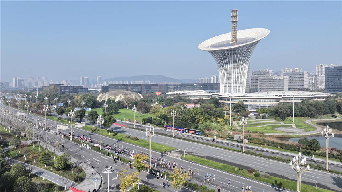 万余名选手途经未来科技城时,与标志性建筑“马蹄莲”同框。