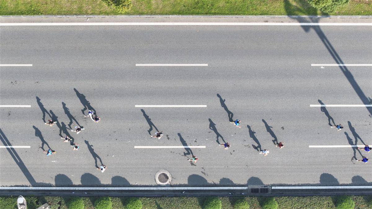 本次马拉松赛道串联光谷生物城、空轨等创新地标,跑者在星河广场、中央生态大走廊间穿行,仿佛踏上未来科技走廊。全马终点设于“马蹄莲”下,以奔跑丈量光谷科创脉动。(湖北日报全媒记者 陈少哲 摄)