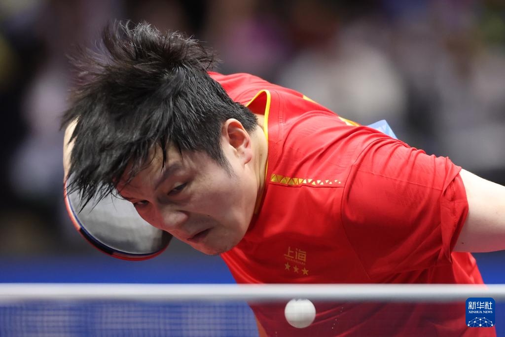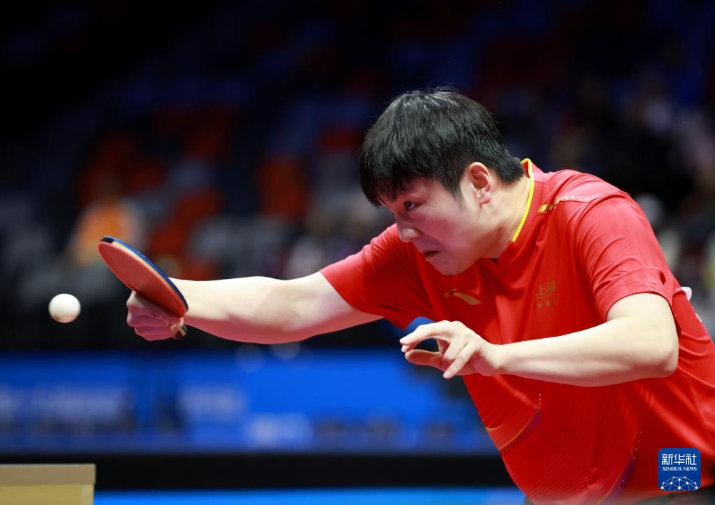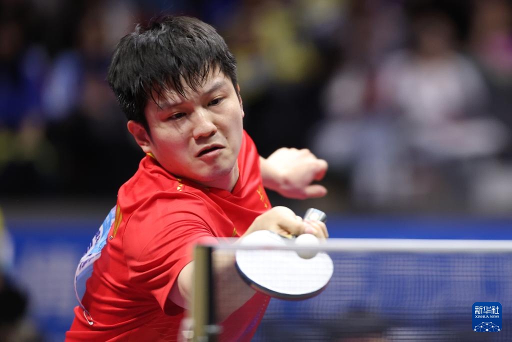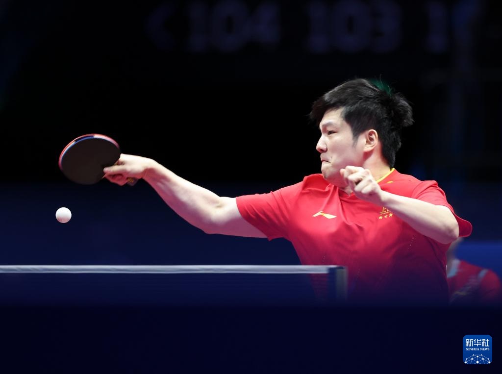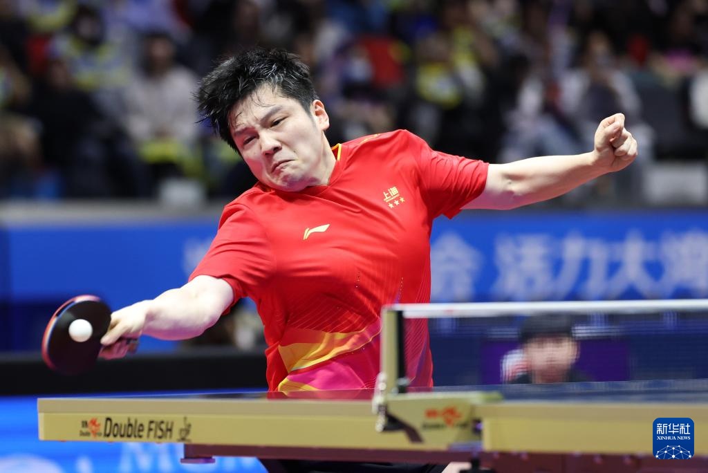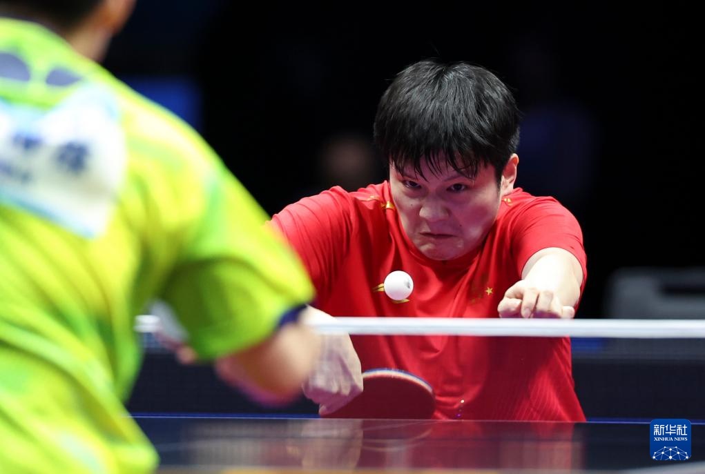 11月16日,上海队选手樊振东(右)在比赛中回球。