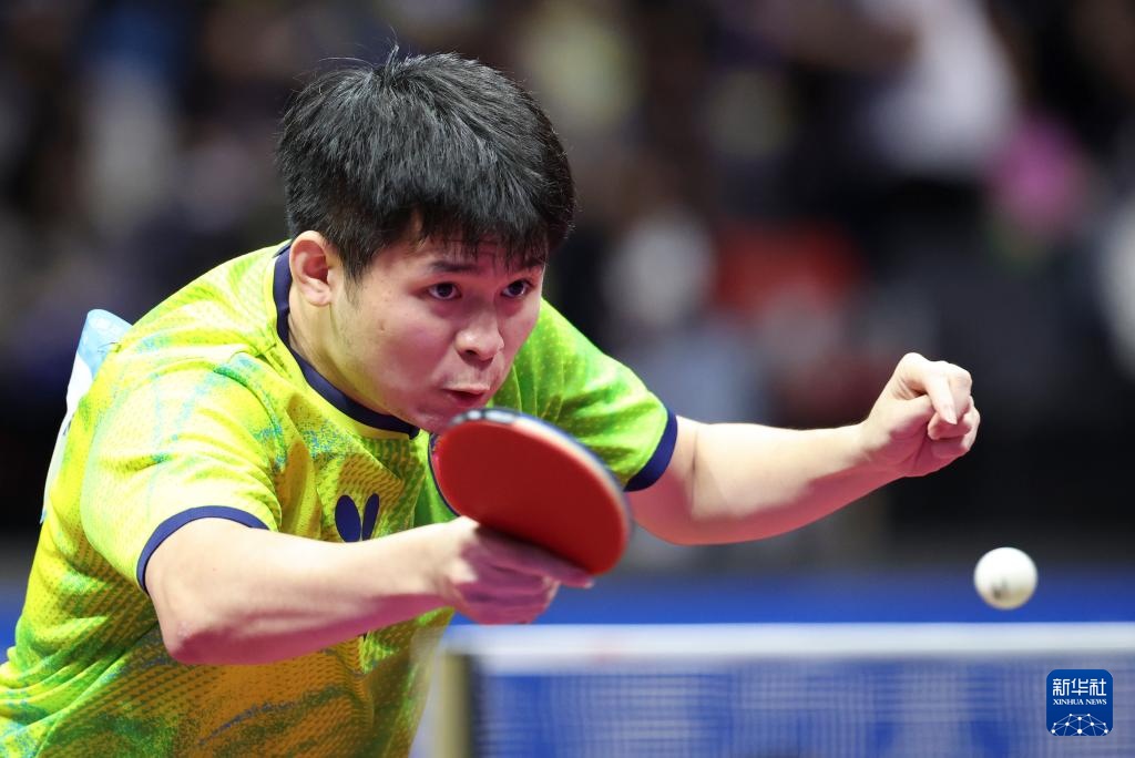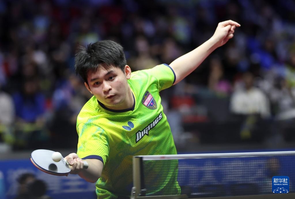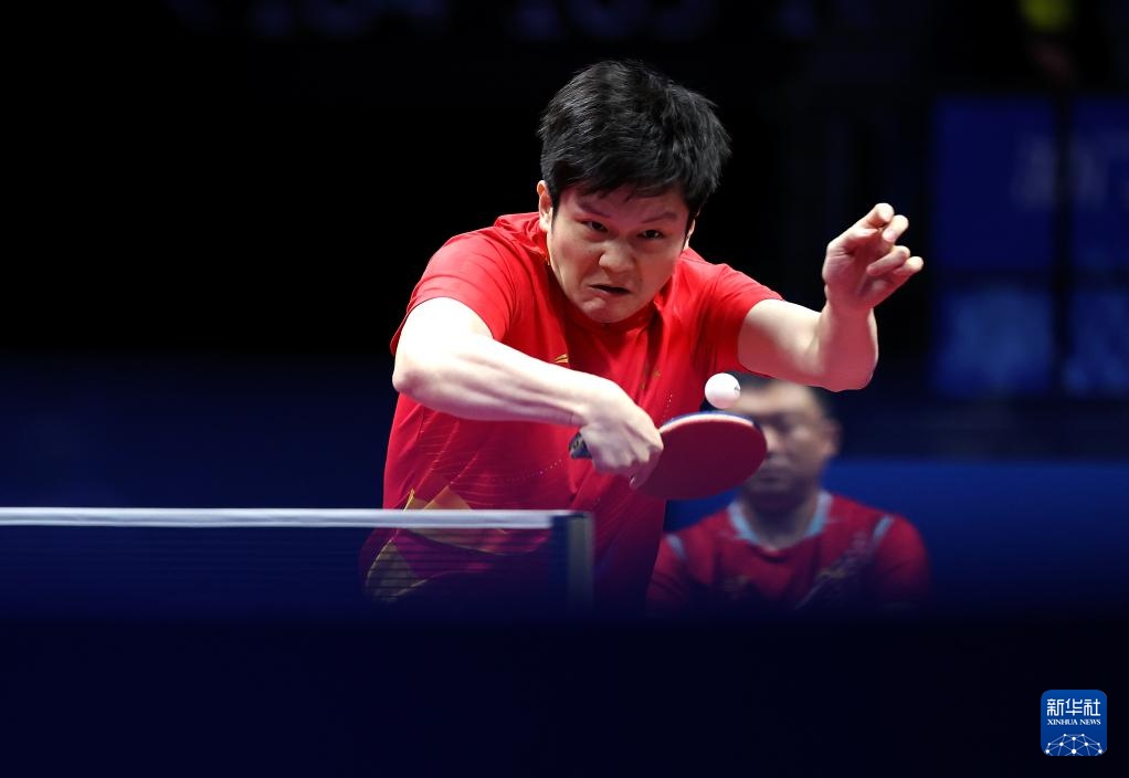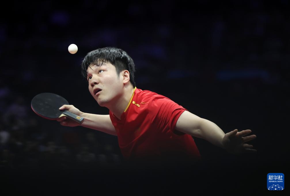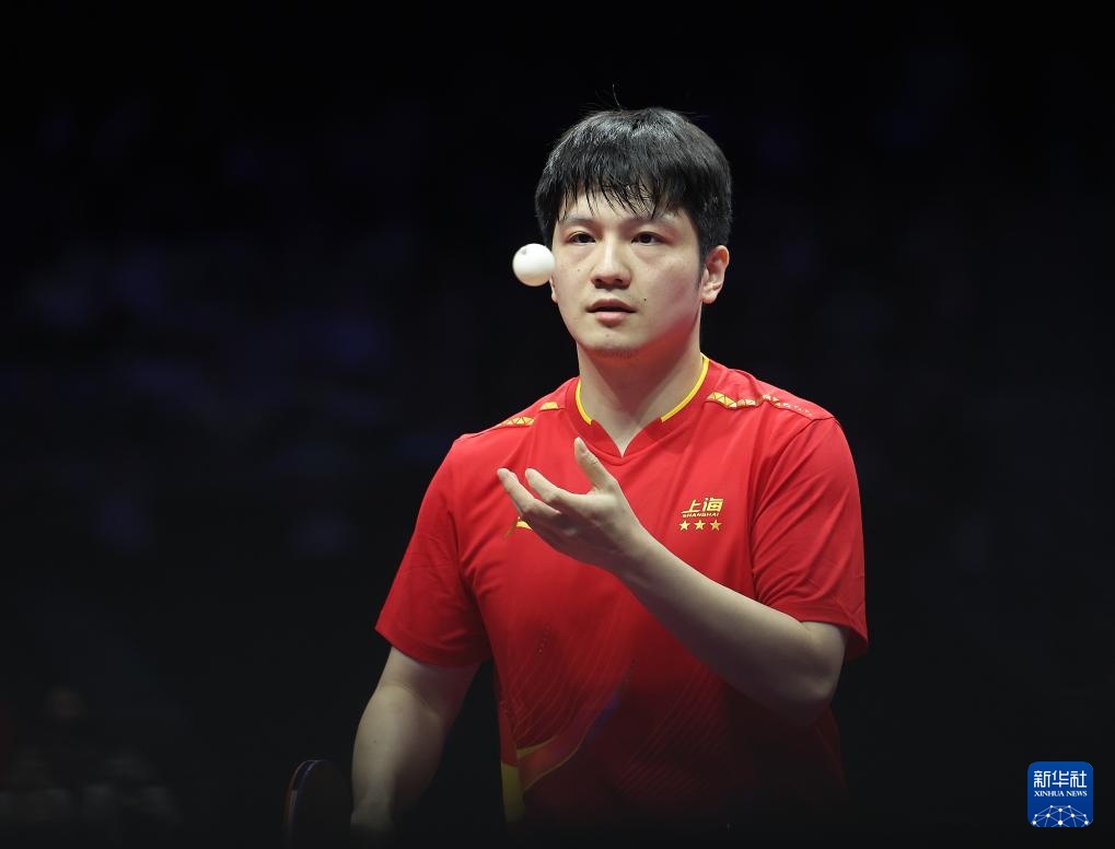 11月16日,上海队选手樊振东(右)在比赛中回球。