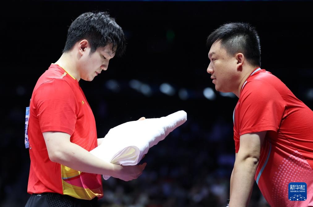 11月16日,上海队选手樊振东(左)在比赛间隙与教练交流。