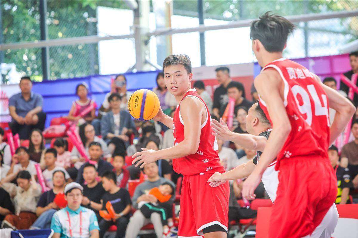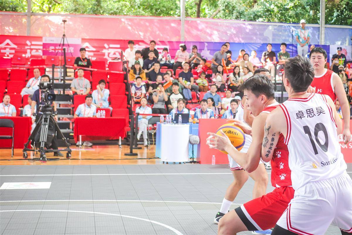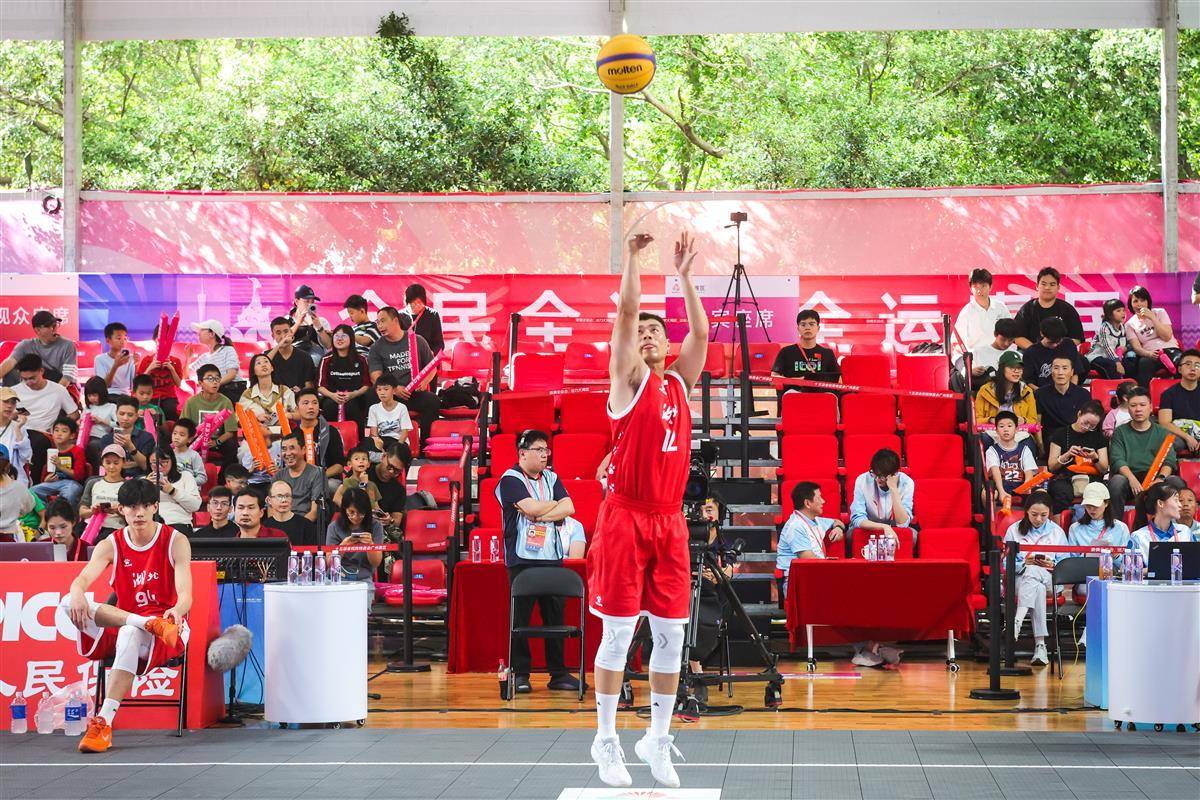 陈佳贺平日肩负着教学和带领校队训练的任务,在繁重的教学任务下,他只能利用休息时间和队友合练。三人篮球群众比赛报名年龄上限为40岁,这是陈佳贺的第一届全运会,可能也是最后一届全运会,作为“30+”,他用汗水和热爱诠释着“三十而已,热血不灭”的篮球信念,“咱们一步步来,争取站在领奖台,冲击最高目标。”(湖北日报全媒记者 时龚 摄)