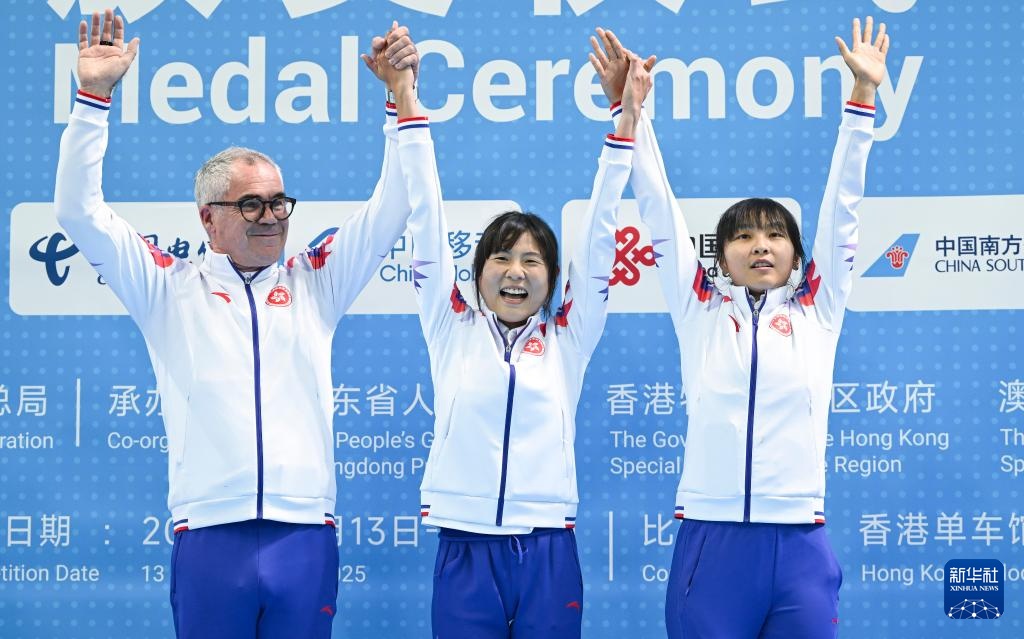11月16日,香港队组合李思颖(右)、梁颖仪(中)和教练员在颁奖仪式上。最终,她们获得冠军。