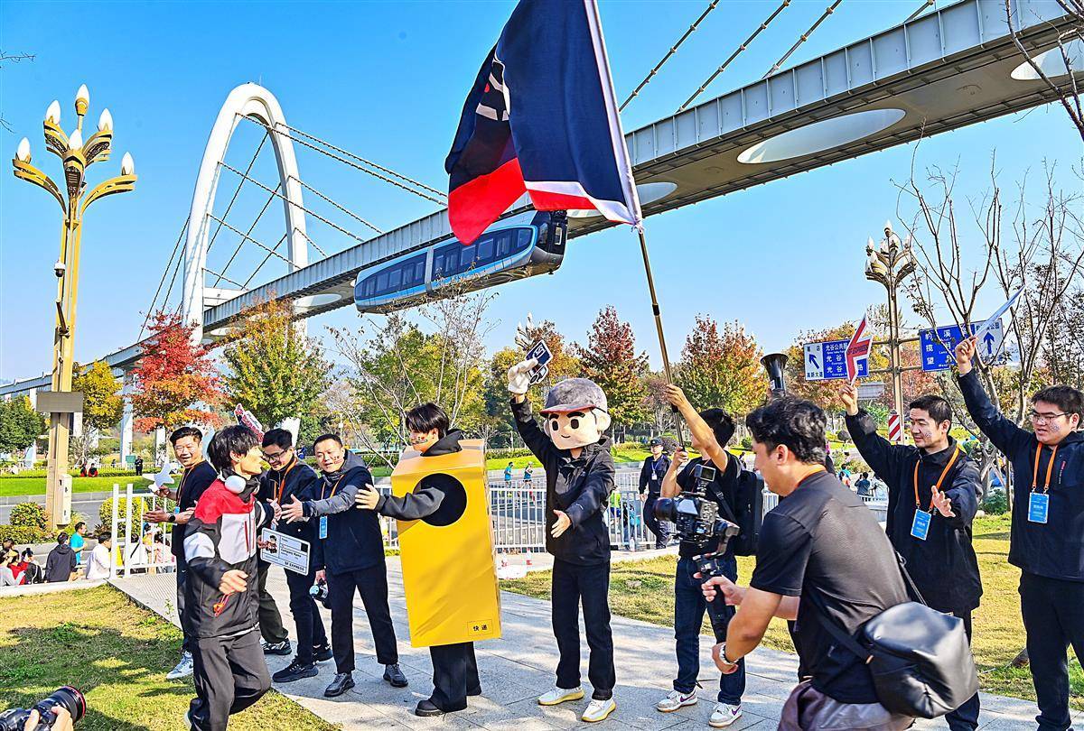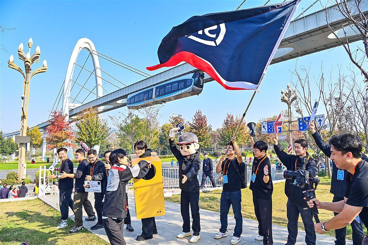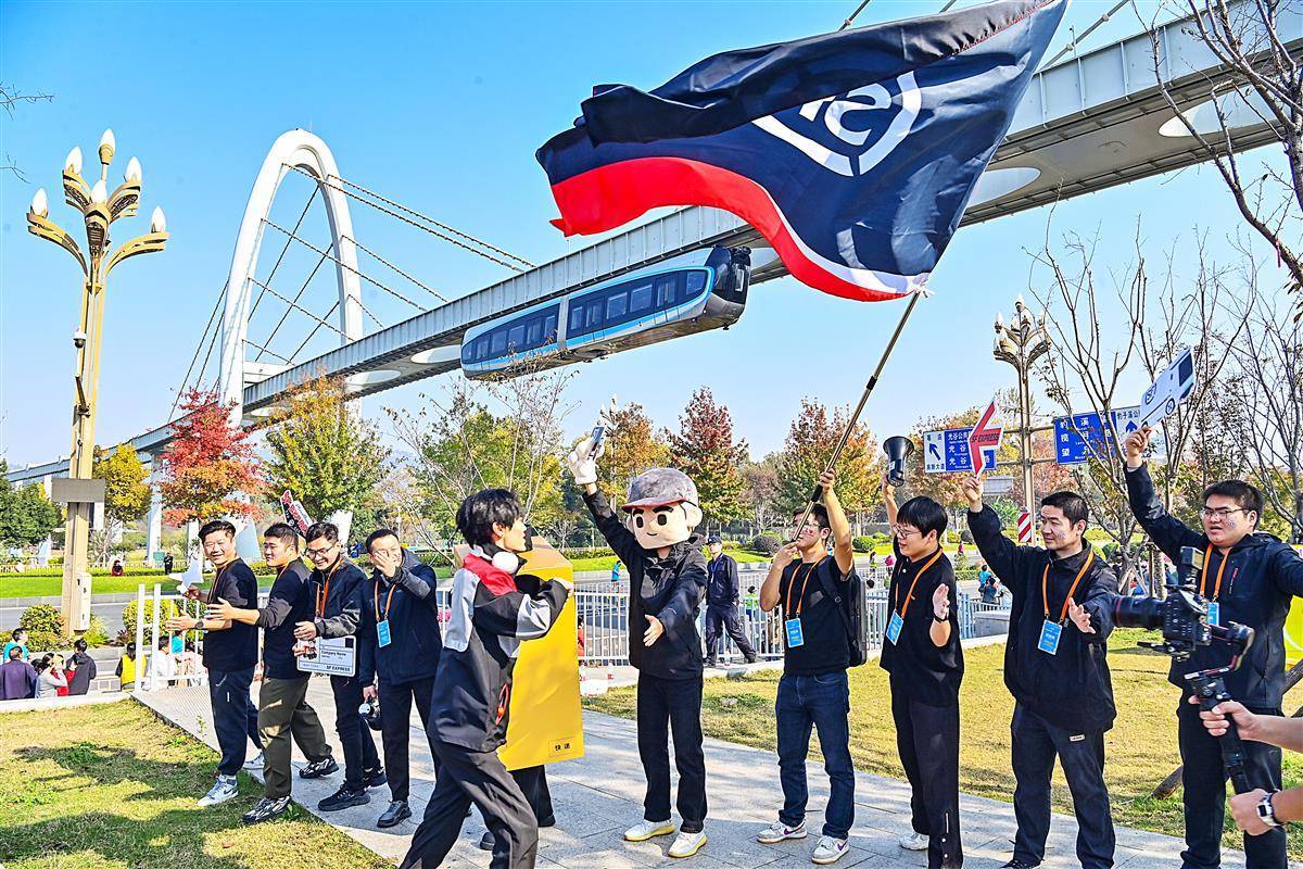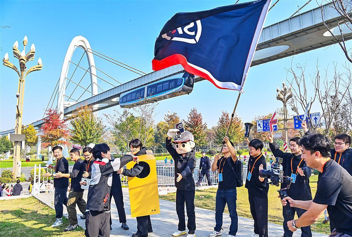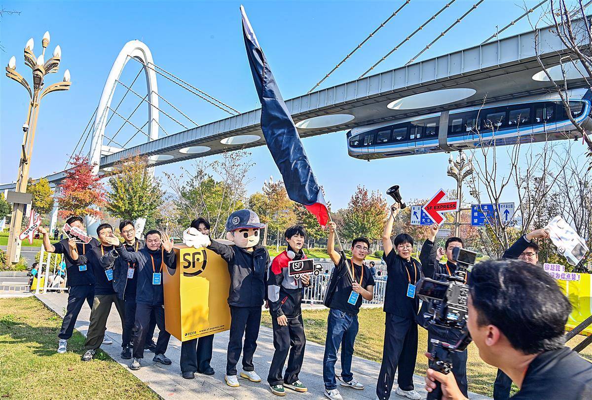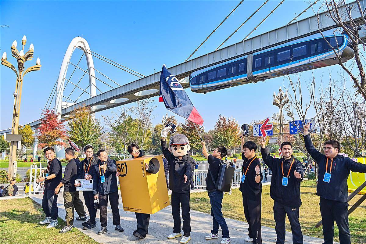 11月16日,2025光谷马拉松在武汉东湖高新区鸣枪开跑。某快递公司在光谷高新大道的空轨轨道下举行快闪活动,上演一出“光谷光子号”空轨与跳舞者同框的大戏。(湖北日报全媒记者 朱熙勇 摄)