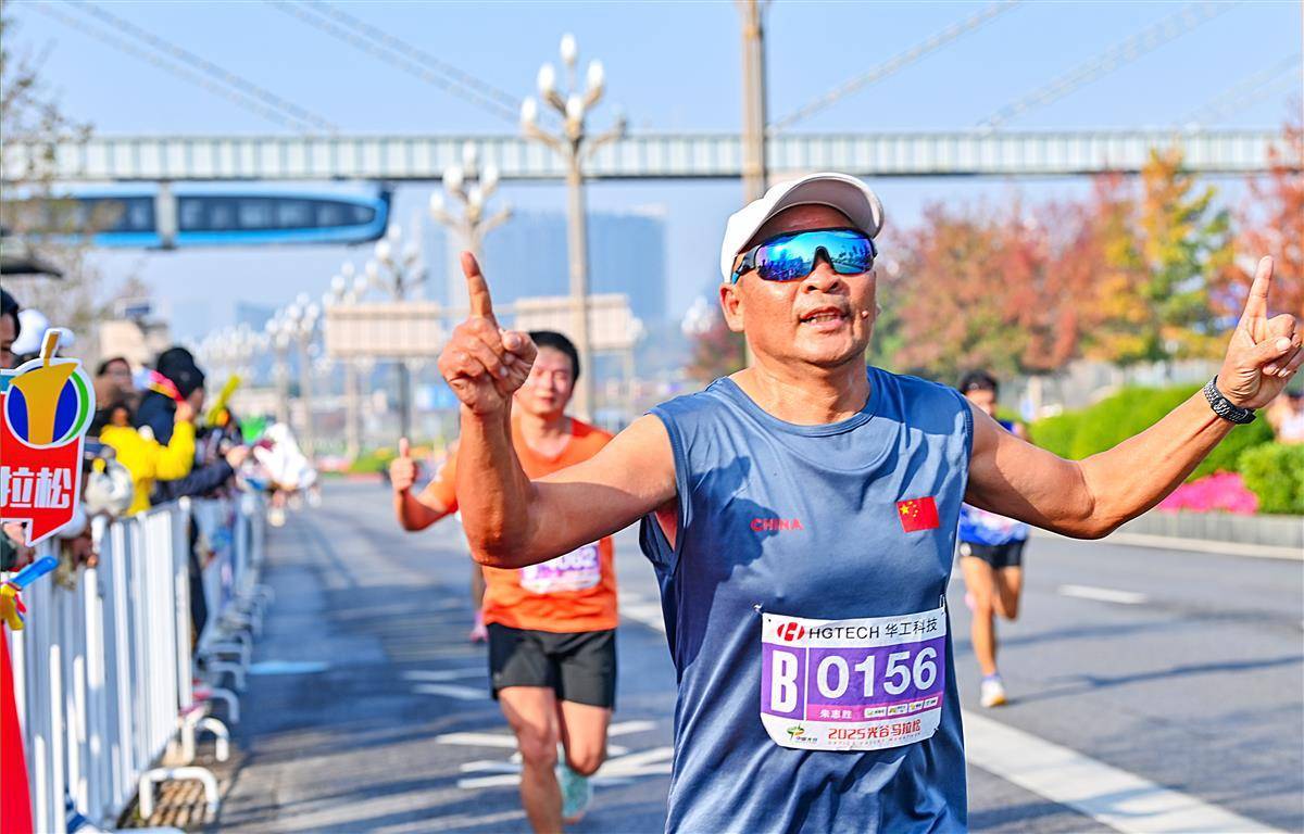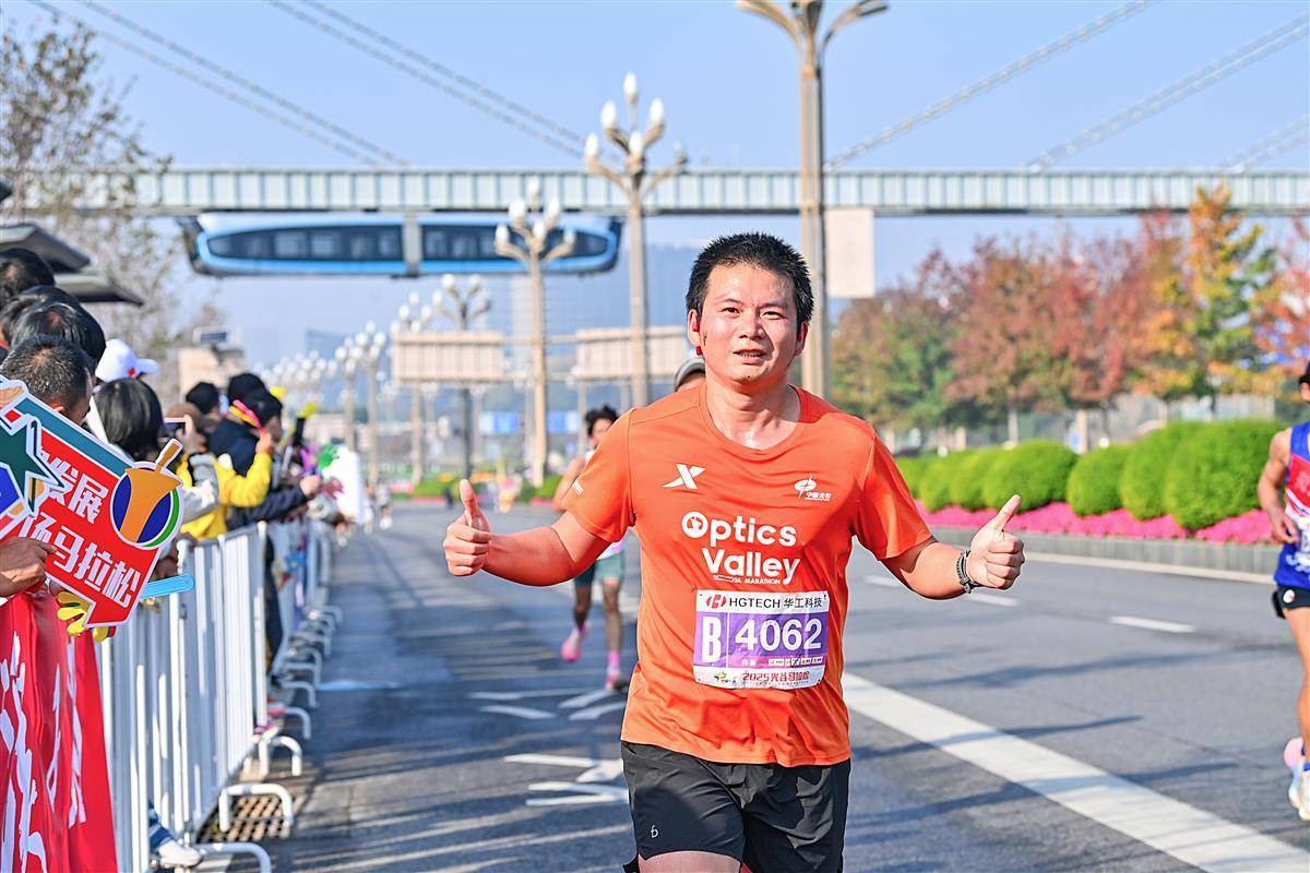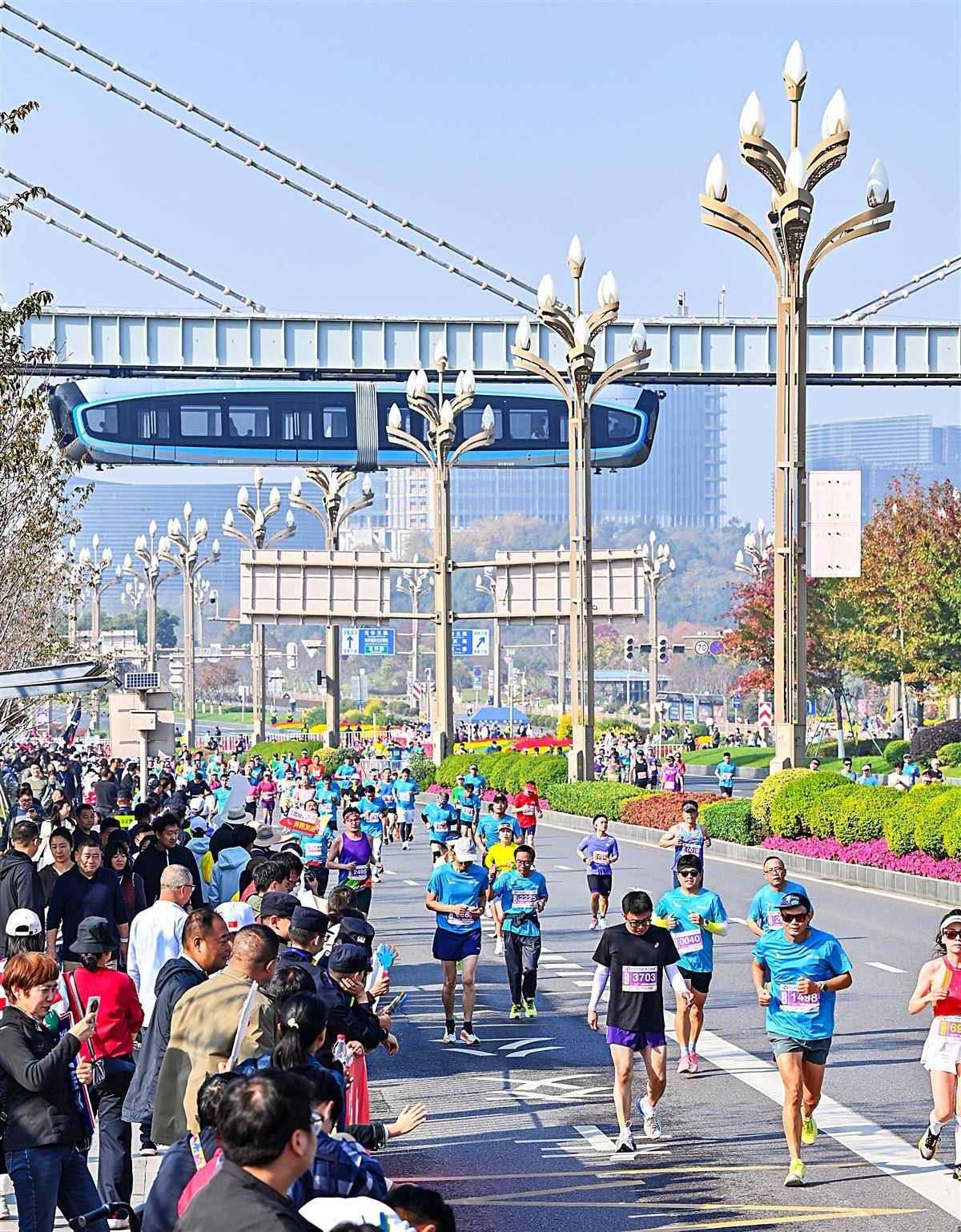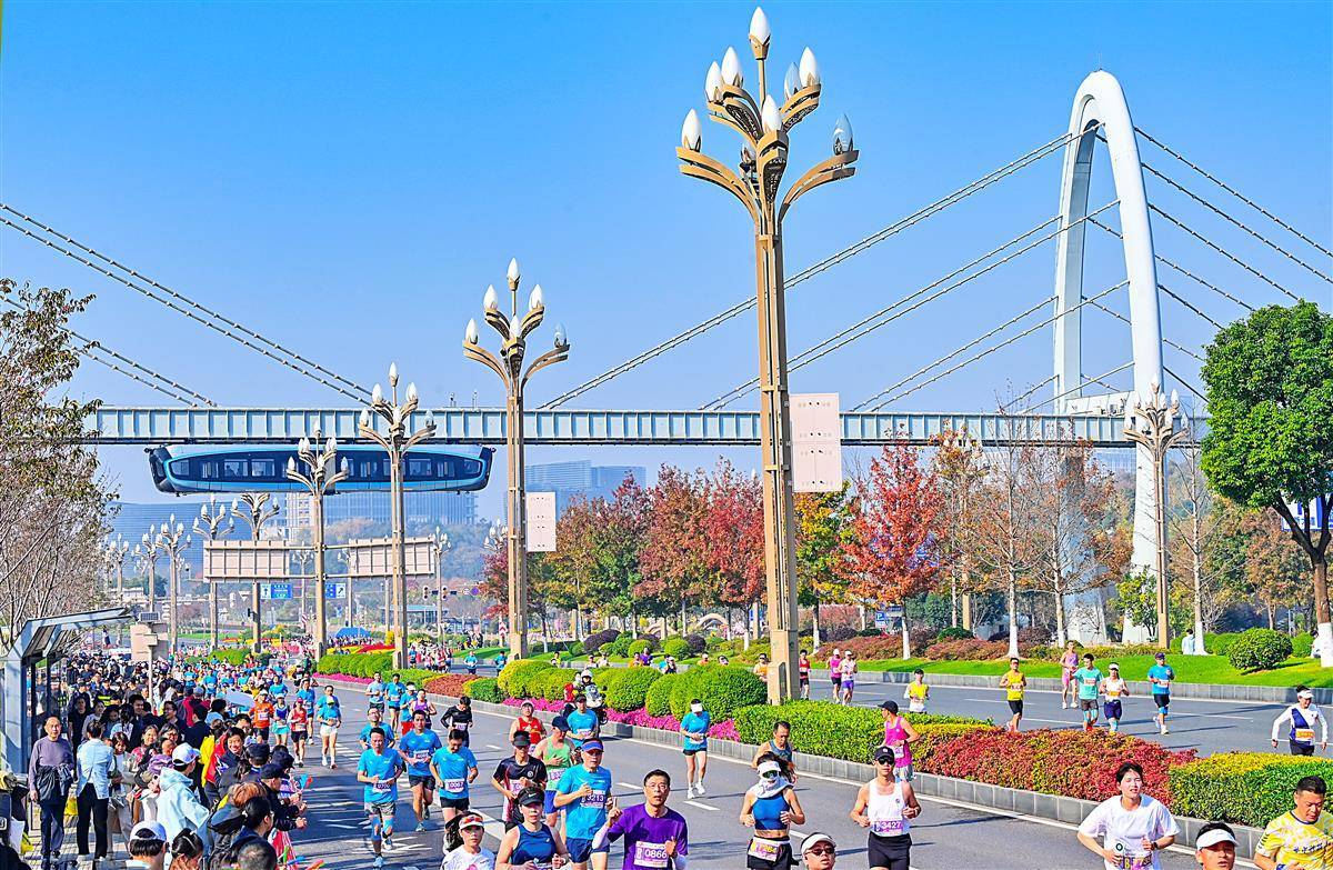 11 月16日, “光谷光子号” 空轨与奔跑的马拉松选手同框。当日,2025光谷马拉松在武汉东湖高新区鸣枪开跑,选手与光谷空轨“同框赛跑”成标志性场景,赛道沿途设空轨站点,科技感与运动精神深度融合。(湖北日报全媒记者 朱熙勇 摄)